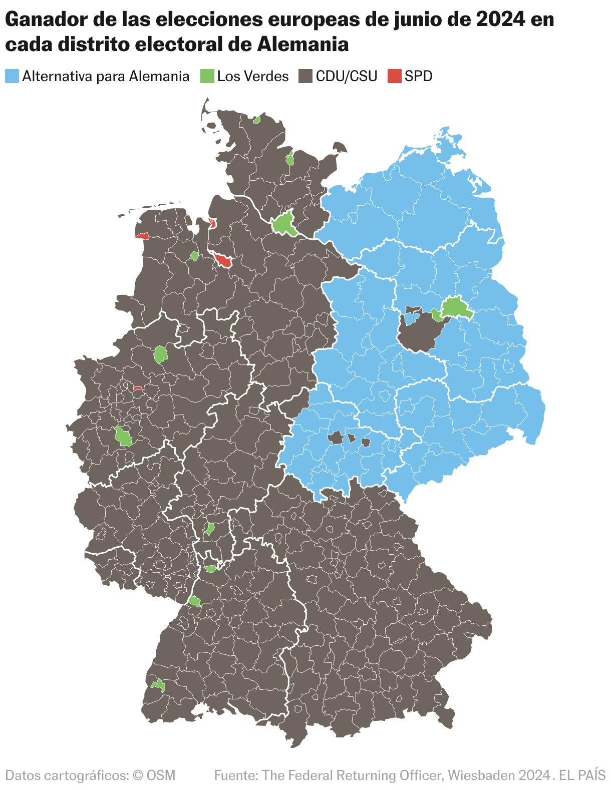 Los resultados de los comicios de este domingo se leerán como la prueba palpable de que Alemania ha fracasado a la hora de integrar políticamente al este tras la caída del muro. Las desigualdades van más allá de las condiciones materiales. El este está infrarrepresentado en las esferas de poder a escala federal, pese a contar con figuras tan destacadas como la excanciller Angela Merkel o el expresidente federal Joachim Gauck. Una encuesta reciente reveló que solo el 14,3% de los directivos en el Gobierno habían nacido en Alemania oriental. Solo dos de los 35 secretarios de Estado del Ejecutivo del socialdemócrata Olaf Scholz proceden de la antigua RDA, mientras los residentes en el este suponen el 20% de la población total. El partido de izquierdas Die Linke ha llegado a pedir una “cuota del este”, al estilo de las cuotas de género, para los altos cargos gubernamentales.