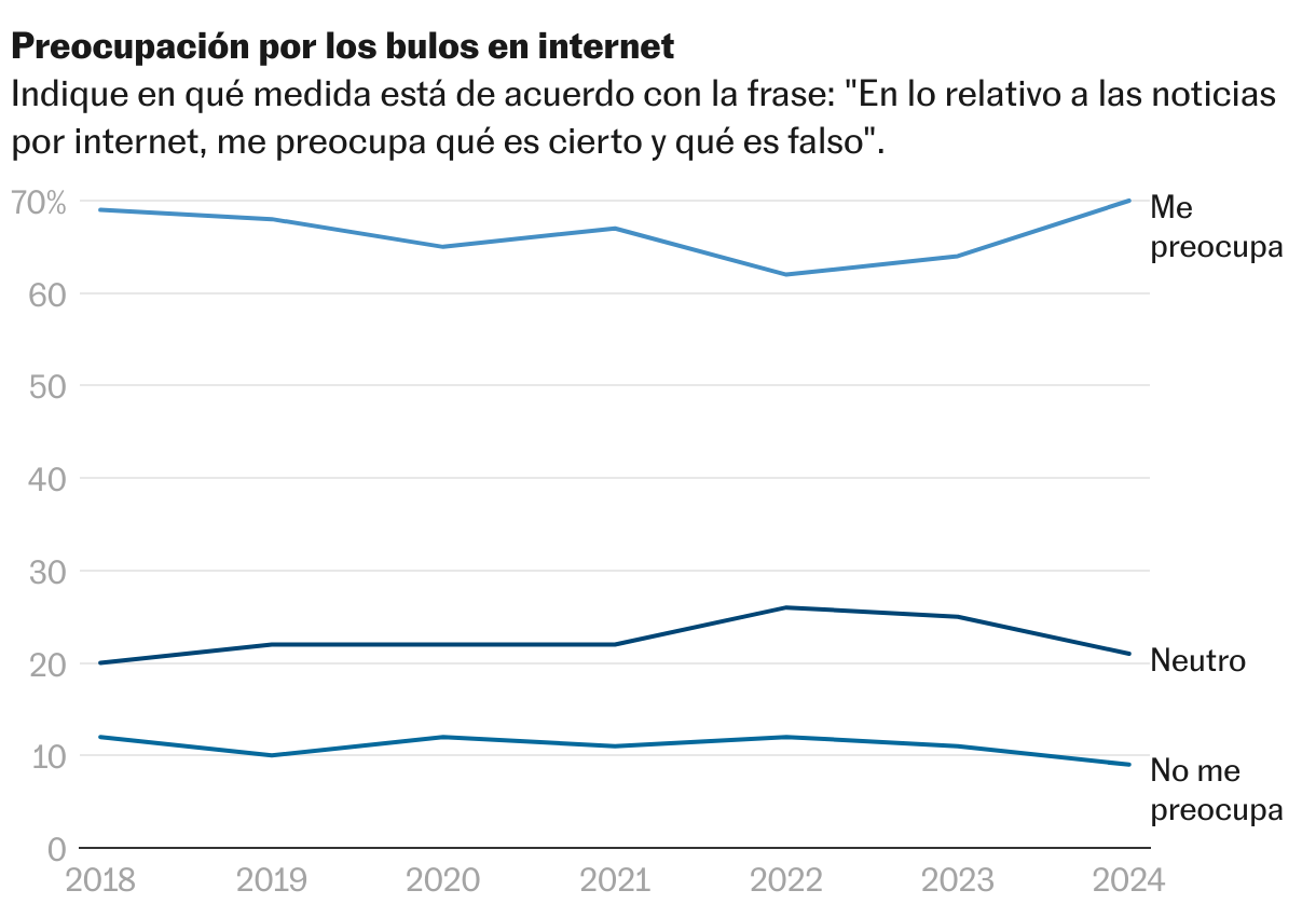 En una España sometida a la tensión política incesante, el estudio encuadra la situación de fatiga informativa en un 44% de los encuestados, por encima del 37% que evitan el consumo de noticias. Si bien, ambos fenómenos aparecen relacionados: el 58% de los desafectos sienten una sobreexposición mediática. Por el contrario, la mitad de los sondeados mantiene un alto interés en las noticias. Esto supone un ligero aumento respecto al informe del año anterior y apunta a una ralentización en la pérdida de interés registrado en estos estudios desde 2015. El 85% mostraba entonces gran interés por la información, cifra que cayó progresivamente hasta el 52% en 2023. Por tramos de edad, el porcentaje de desconexión llega al 44% entre los jóvenes y al 35% entre los mayores de 35 años. Entre sus causas reside una percepción de que ciertos temas críticos no tienen suficiente cobertura periodística. A pesar de que la mayoría vislumbra una oferta mediática abundante en deportes, política, asuntos internacionales y entretenimiento, solo la mitad considera suficiente cobertura sobre delincuencia y seguridad, educación o justicia social, mientras que las audiencias más jóvenes muestran un aumento de interés en áreas como la salud mental y el medio ambiente. Pero si algo dispara las cifras en España son los bulos.