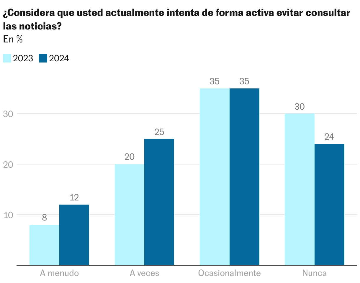 En pleno súper año electoral que avanza en la mitad del planeta y disemina sus estragos por la Unión Europea mientras persisten las guerras en Ucrania y Gaza, el desinterés por la información alcanza un récord histórico global. Así lo refleja el nuevo informe anual sobre noticias digitales que elabora el Instituto Reuters para el Estudio del Periodismo. Según el estudio que esta entidad de la Universidad de Oxford ha hecho público en la madrugada de este lunes, cuatro de cada diez encuestados evita las noticias con frecuencia. La cifra llega al 39% y supera en un punto porcentual al anterior récord de aversión registrado por este análisis en 2022. Además, supone un crecimiento de tres puntos respecto al año anterior y diez más del 29% que manifestaba la misma tendencia en 2017. En España, el desapego crece ocho puntos durante los últimos doce meses y alcanza el 37%. El latente problema de la desinformación es una de las causas del desinterés generalizado.