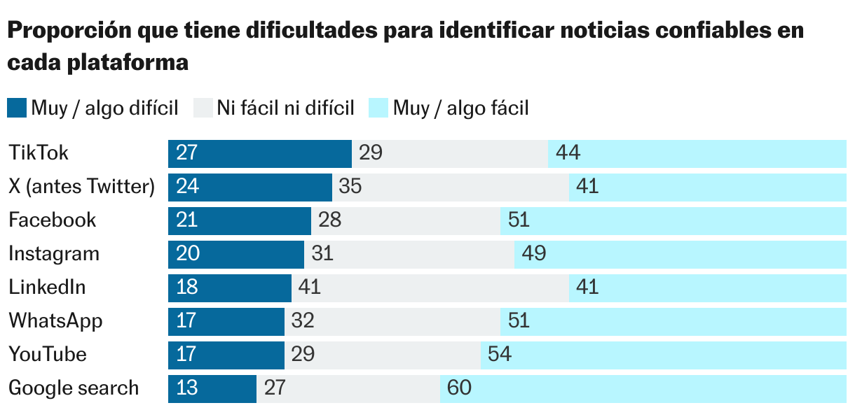 Seis de cada diez encuestados dudan de la veracidad de los contenidos online, proporción que en España alcanza a siete de cada diez. Así ocurre también en Estados Unidos, donde el 72% muestran inquietud al respecto, y la cifra se dispara en Sudáfrica hasta el 81%, países ambos con elecciones este año. Entre las plataformas, TikTok y X (antes Twitter) alcanzan los primeros puestos en la dificultad para distinguir el contenido confiable del no confiable, mientras que ambas aplicaciones han albergado desinformación o conspiraciones sobre la guerra en Gaza y la salud de la princesa de Gales. En países como Reino Unido, Estados Unidos y México destaca la creciente inquietud sobre las imágenes “fotorrealistas” generadas por Inteligencia Artificial y los vídeos deepfake o falsos profundos. El informe anual del Instituto Reuters sobre noticias digitales reúne casi 100.000 entrevistas en 47 países (unas 2.000 por país), realizadas entre finales del pasado enero y principios de febrero a través de la compañía de investigación de mercados YouGov. En la elaboración del muestreo español han participado investigadores de la Universidad de Navarra.