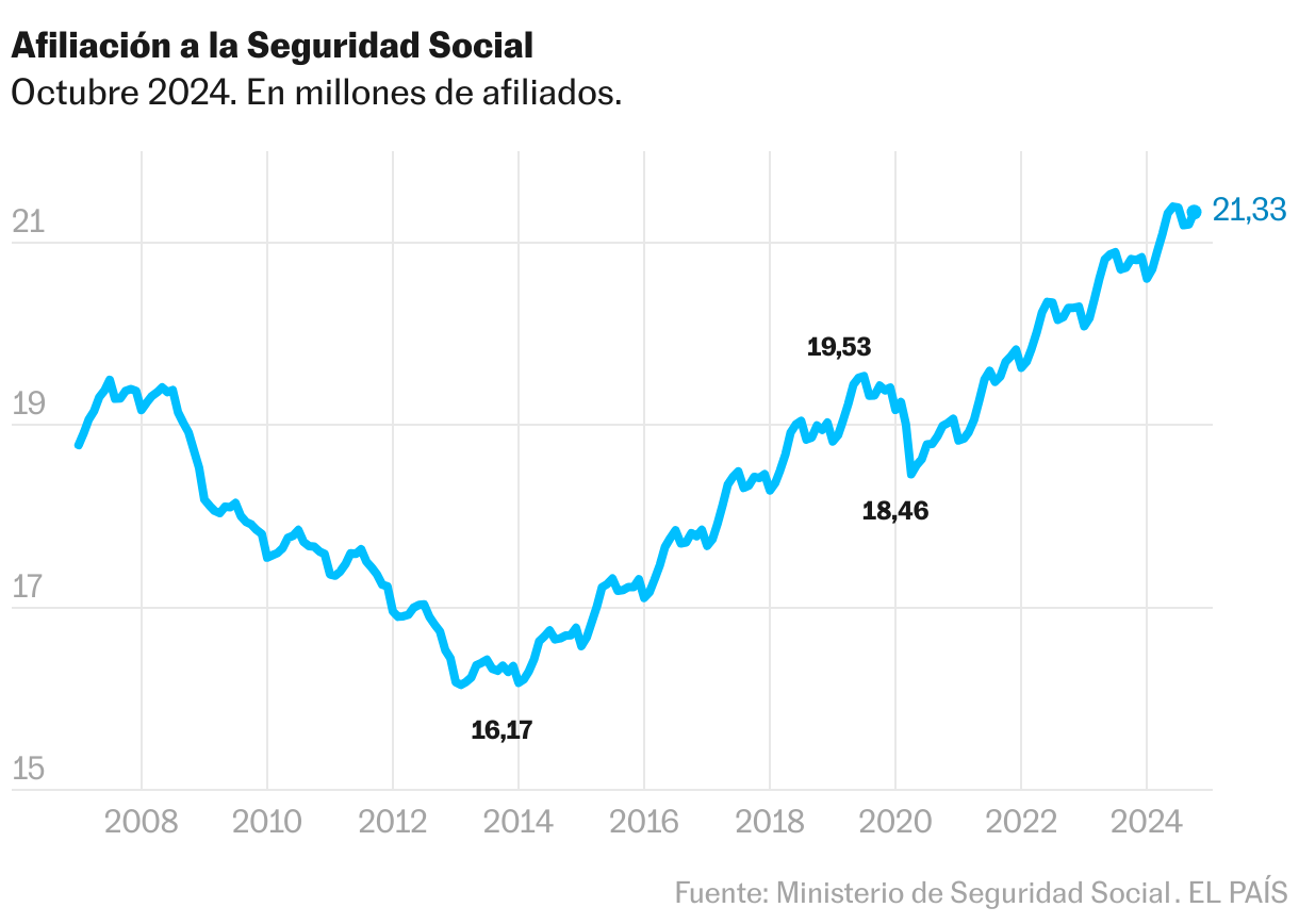 Desde que el techo de los 21 millones de afiliados medios se rompiera en abril, por séptimo mes consecutivo, el número de cotizantes se situó de nuevo en octubre por encima de esta barrera, alcanzando la cantidad más elevada en los últimos trece años para este periodo. Y es que la subida de más de 134.000 afiliados medios es la segunda más alta que se ha producido desde 2011 (solo superada por la de 2021, con 159.500, y que estuvo influenciada por la pandemia).