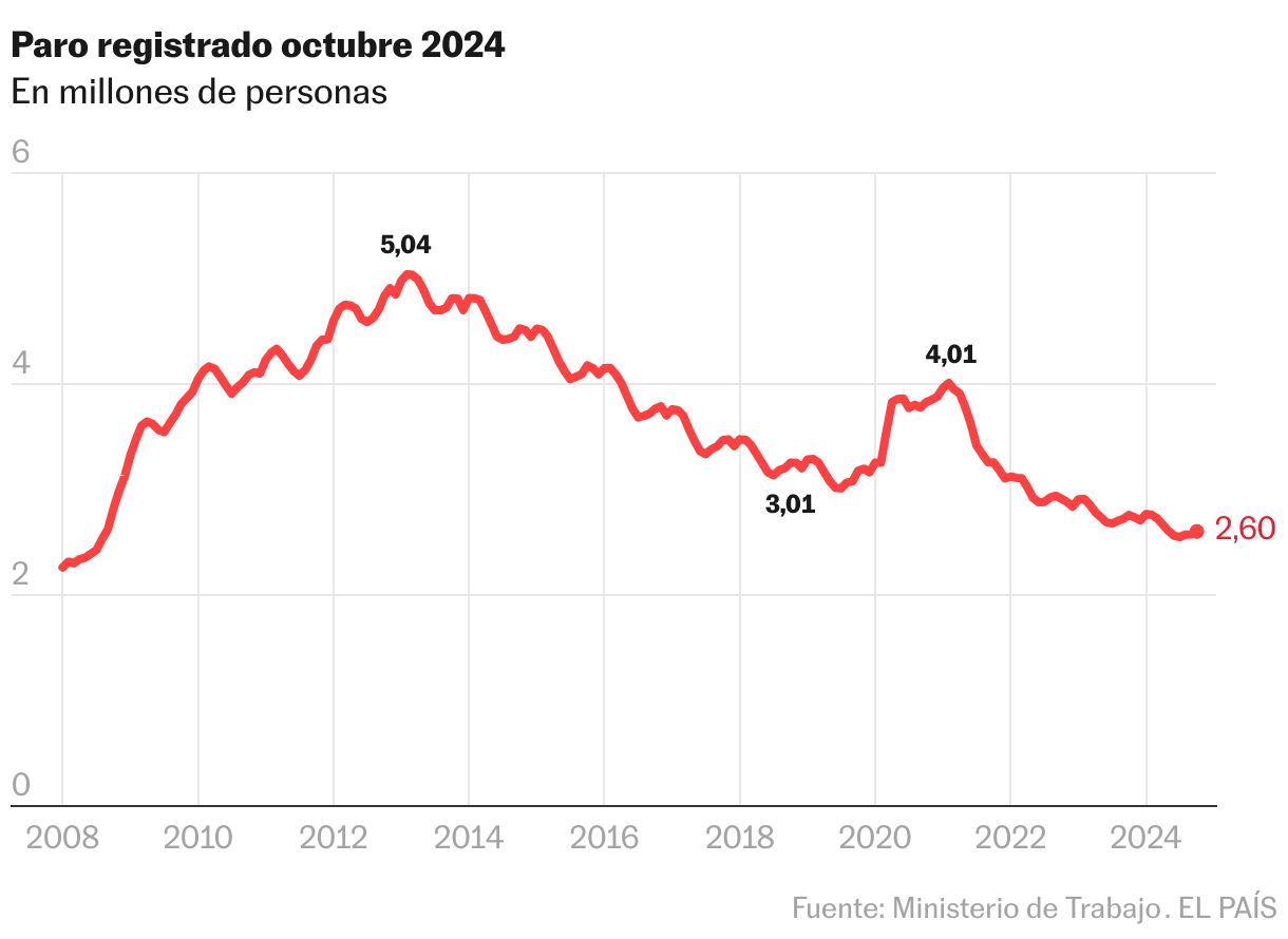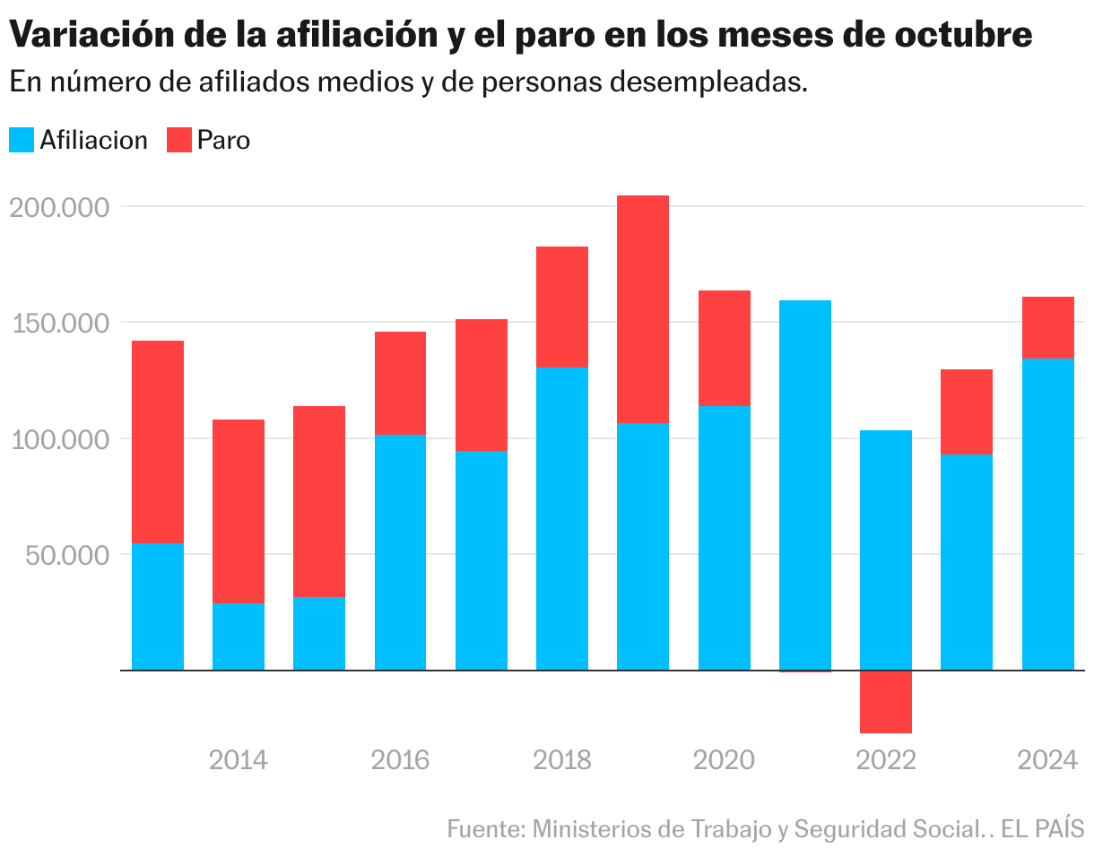 Superado el verano y con la temporada navideña todavía lejos, el empleo sufrió una esperada aunque pequeña sacudida en octubre: el paro creció en 26.769 personas, y se situó en los 2.602.054 desempleados. Se trata, sin embargo, de la subida más baja para este mes desde 2013 —con las excepciones de 2021 y 2022, años afectados por la pospandemia en los que la cifra se rebajó—, y del volumen total de parados más contenido en 17 años. En contraposición al incremento de inscritos en las oficinas públicas de empleo del SEPE, el número de afiliados medios a la Seguridad Social se elevó hasta los 21.332.513, merced a los 134.307 puestos de trabajo que se crearon en octubre, la gran parte de ellos en el sector educativo. Es la mayor subida en este mes de los últimos 22 años, con la excepción de 2021, de nuevo como consecuencia de la covid. Con este aumento, a falta de dos meses para que concluya el año, hay medio millón más de personas trabajando que en el mismo periodo de 2023.