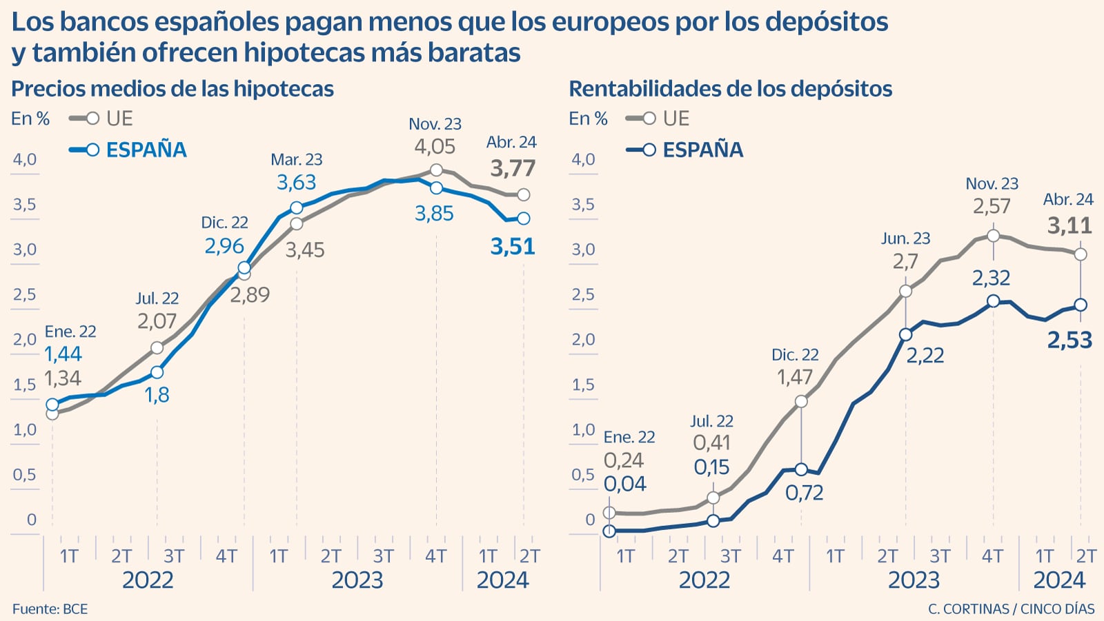En realidad, los bancos españoles se han mantenido durante los últimos dos años a la zaga europea en cuanto a la remuneración de los depósitos. En el mes de abril (que son los últimos datos disponibles en el BCE), de media, las entidades nacionales pagan unos intereses del 2,53 % mientras que la media de la Unión Europea era el 3,11%. Solo los bancos de Croacia (1,81%), Grecia (1,92%), Eslovenia (1,85%) y Chipre (2,06%) pagan menos que los españoles. El sector viene justificando esta escasa o nula remuneración del pasivo en que cuentan con excesiva liquidez, debido al ahorro acumulado durante los años de la pandemia por los hogares y a los programas del BCE (conocidos como TLTRO) que facilitaban la financiación a los bancos.