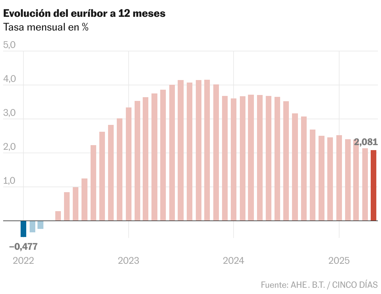 El euríbor ha cerrado este mes de mayo con una nueva caída, la cuarta consecutiva, para situarse en el 2,081%, su nivel más bajo desde agosto de 2022. El indicador hipotecario sigue beneficiándose de los datos favorables de inflación —del 2,2% en la zona euro—, y de los temores de un menor crecimiento por la guerra comercial, que están empujando al Banco Central Europeo a emprender rebajas adicionales de los tipos de interés.