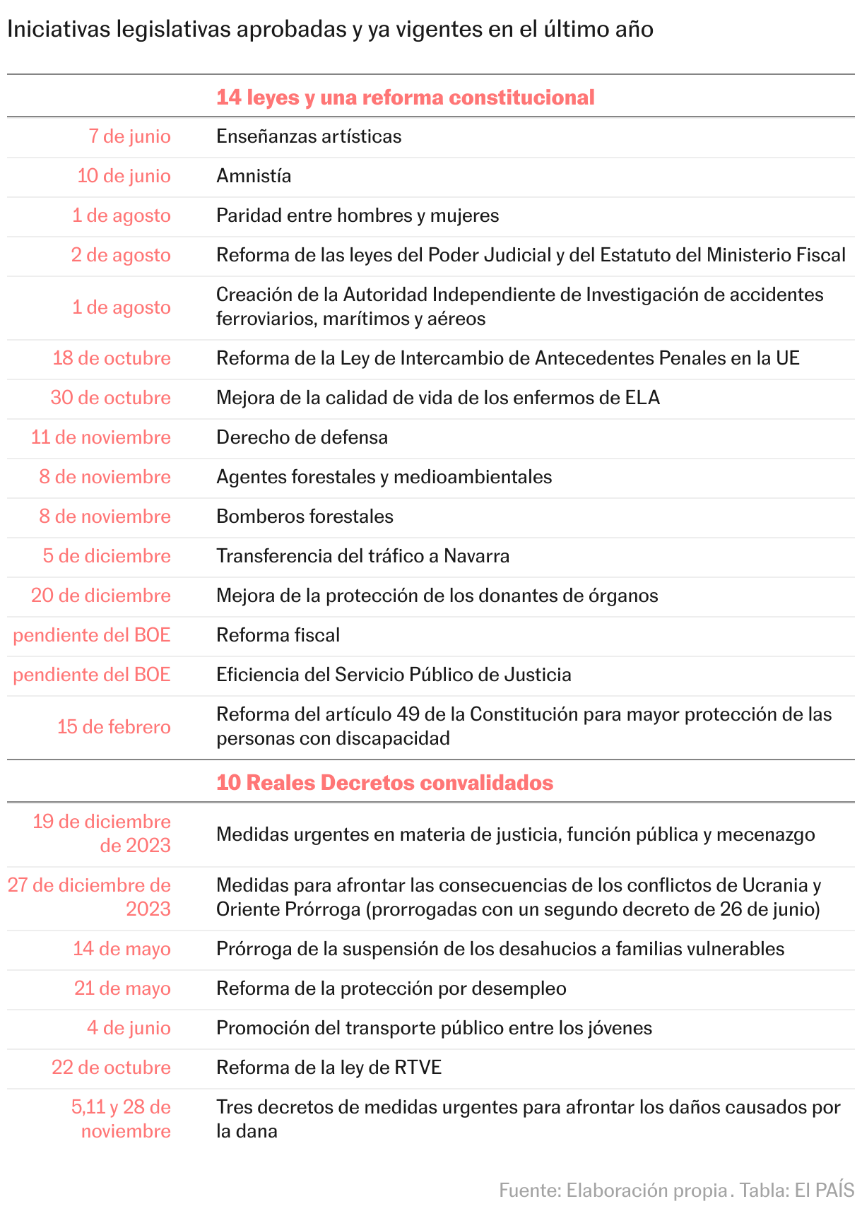 De los proyectos ya vigentes, además de los reseñados, sobresalen la amnistía, por supuesto, reformas como la de la ley del Poder Judicial –pactada por PSOE y PP-, la de la protección por desempleo o la del funcionamiento de RTVE, así como la ley de paridad entre hombres y mujeres. En el cómputo se incluyen los tres decretos para paliar los daños de la gota fría y los dos que prorrogan las medidas extraordinarias adoptadas por las consecuencias de la guerra de Ucrania.