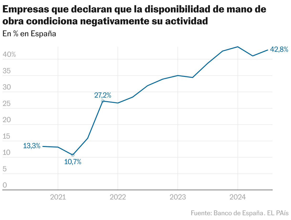 Ese es uno de los argumentos centrales de quienes defienden la estadística del INE, que España no puede sufrir un problema de vacantes a la vez que registra la mayor tasa de desempleo de la Unión Europea (11,2%, frente al promedio del 5,9%). Los contrarios a esta posición defienden que es perfectamente compatible si hay un desacoplamiento entre las habilidades ofertadas y las demandadas y si no hay movilidad laboral. Uno de los estudios centrales que sustentan esta posición es la Encuesta a las empresas españolas sobre la evolución de su actividad, del Banco de España. En el tercer trimestre el 42,8% de las empresas consultadas dicen que la disponibilidad de mano de obra condiciona negativamente su actividad, más del doble que hace solo tres años.