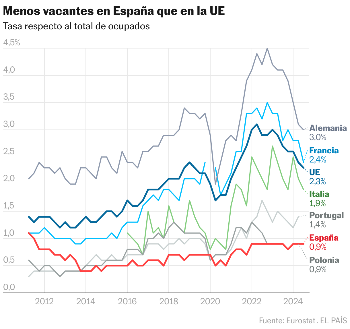 Antes de su anuncio, que reconoce un margen de mejora en los datos, el INE defendió la capacidad de la ETCL para radiografiar las vacantes. El último dato, del segundo trimestre, recoge 151.379 vacantes en España, el segundo registro más alto de la serie, solo por detrás de las 155.797 del tercer trimestre del año pasado. “El INE difunde los datos en su web y los transmite a Eurostat. No todos los países tienen la misma cobertura, algunos no cubren todas las secciones económicas, otros no incluyen de administraciones públicas…”, explicó Fuente. Con ello Eurostat emite una tasa que compara entre países. En España es bajísima, un 0,9% —con leves variaciones desde que hay registros, independientemente del ciclo económico—, empatado con Polonia y solo por encima de Bulgaria (0,8%) y Rumanía (0,7%). Esta lejísimos de la media continental (2,4%), que viene bajando en los últimos meses por el parón alemán y el de otros países de Europa central. La teoría dice que, a menos actividad, menos demanda de mano de obra y menos vacantes. Y, de nuevo en teoría, a más personas paradas, menos probable es que haya vacantes.