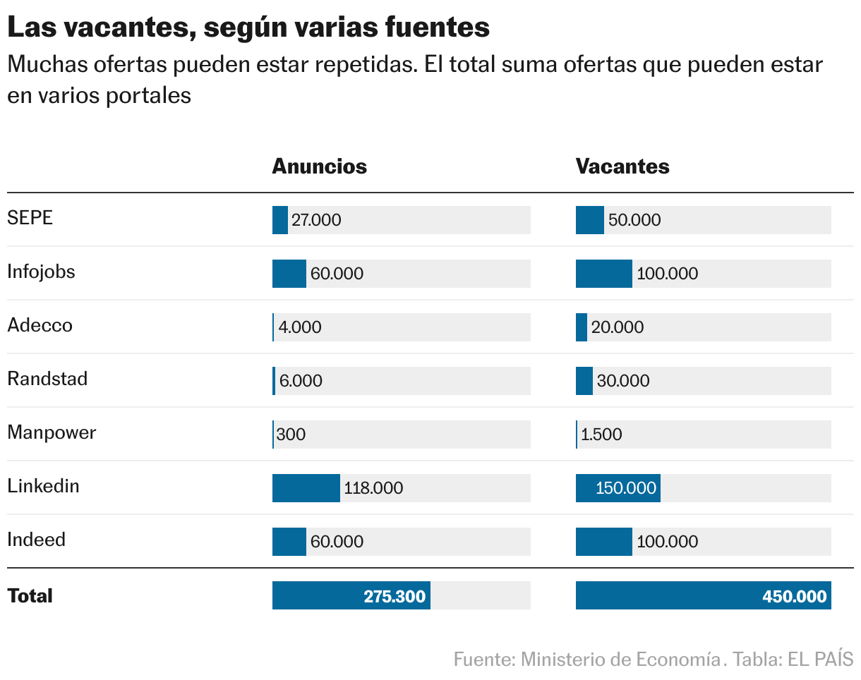 El debate de las vacantes de empleo sin cubrir es uno de los más espinosos de la conversación laboral española. En otros asuntos hay discusión sobre las soluciones o sobre qué nos depara el futuro, pero al menos hay consenso en los hechos tangibles, en los números. No es el caso en las vacantes: algunos defienden que apenas hay puestos de trabajo sin cubrir, tomando como base las estadísticas oficiales; otros que esas estadísticas no están captando la dimensión del problema. A finales de noviembre se dio un debate interesantísimo al respecto en el Consejo Superior de Investigaciones Científicas, durante el Encuentro entre productores y usuarios de estadísticas del mercado laboral, organizado por CSIC, Fedea e INE. Esta última institución, que produce la estadística oficial de vacantes y que Eurostat toma como referencia, anunció un cambio: estudiará una mejora con los datos de los portales web de empleo.