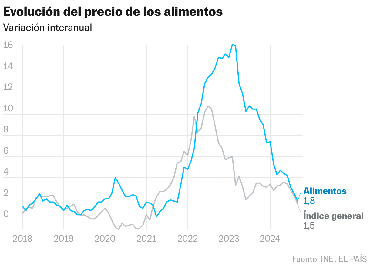 El Ministerio de Economía destaca que la inflación se ha reducido de forma notable en septiembre, ocho décimas, hasta el 1,5%, la tasa más baja en los últimos tres años y medio (desde marzo de 2021) y por debajo del umbral de referencia del BCE. Y destaca que especialmente significativa es la reducción de los precios de los alimentos, con la disminución de siete décimas de la tasa interanual hasta situarse en el 1,8%, la menor en casi tres años (desde octubre de 2021). Destaca en septiembre la bajada del precio del aceite, que se redujo el 2,2%. Esta reducción continuada está permitiendo acercar la inflación de los alimentos al índice general, gracias a las medidas de apoyo adoptadas.