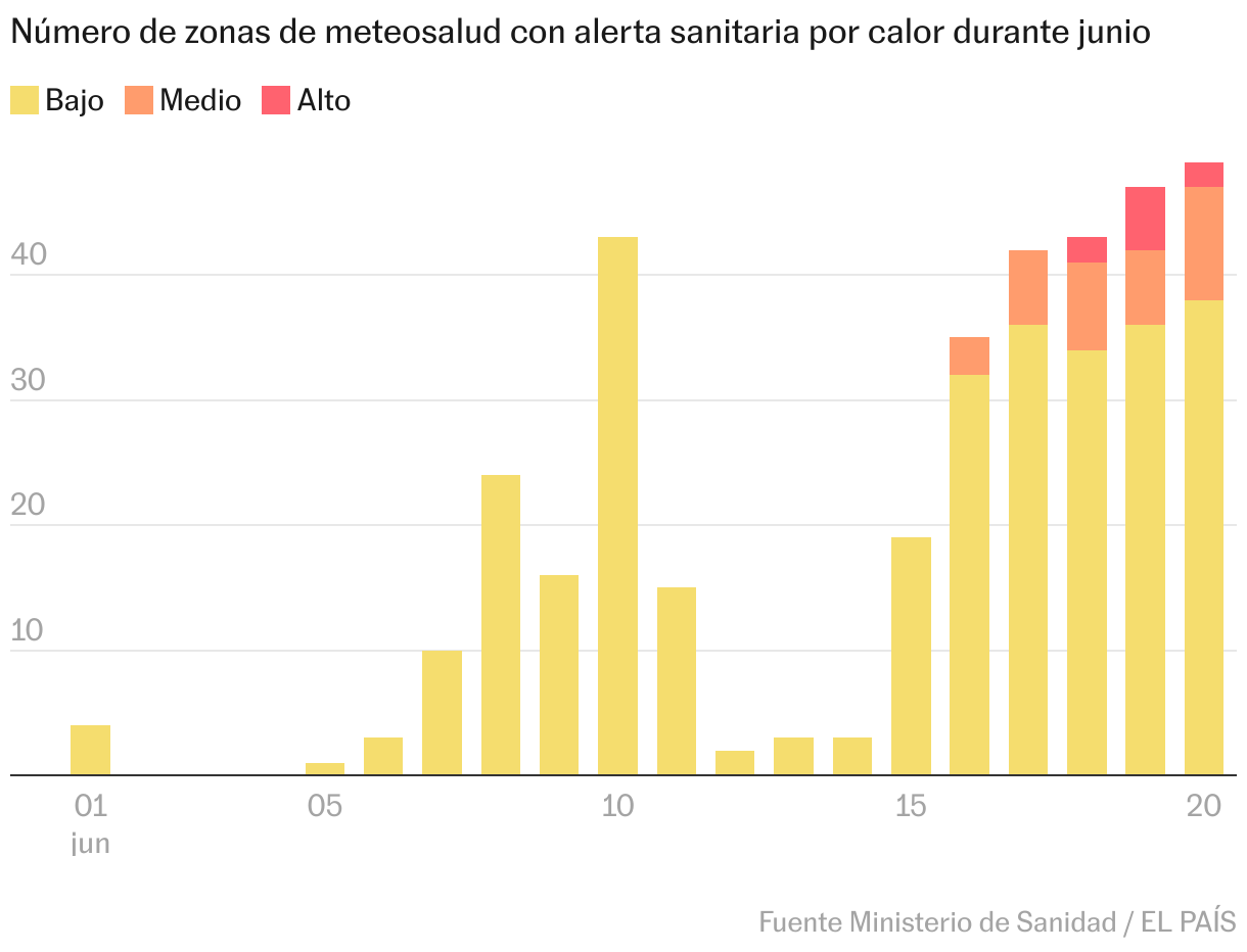 Este calor que deja tórridas noches y días insufribles no es normal. De hecho, este mes se perfila ya en España como el junio más cálido desde que hay registros, como se desprende de los datos facilitados a EL PAÍS por la Agencia Estatal de Meteorología (Aemet). Las altas temperaturas, por encima de lo normal para este momento —lo que supone una señal más del cambio climático causado por el ser humano— han disparado las alertas de riesgo para la salud que envía el Ministerio de Sanidad. Todos los días de lo que va de junio, salvo tres, ha habido activos avisos de este tipo por calor.