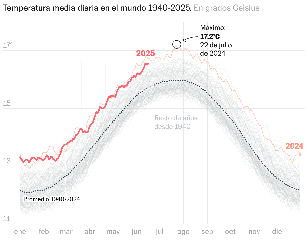 Pero no es solo una cuestión que se circunscriba a España. En el resto del planeta también las temperaturas están por encima de lo normal. Según los datos que ofrece Copernicus, este junio está entre los tres junios más cálidos en la superficie de la Tierra. Los otros dos son los de 2024 y 2023.
