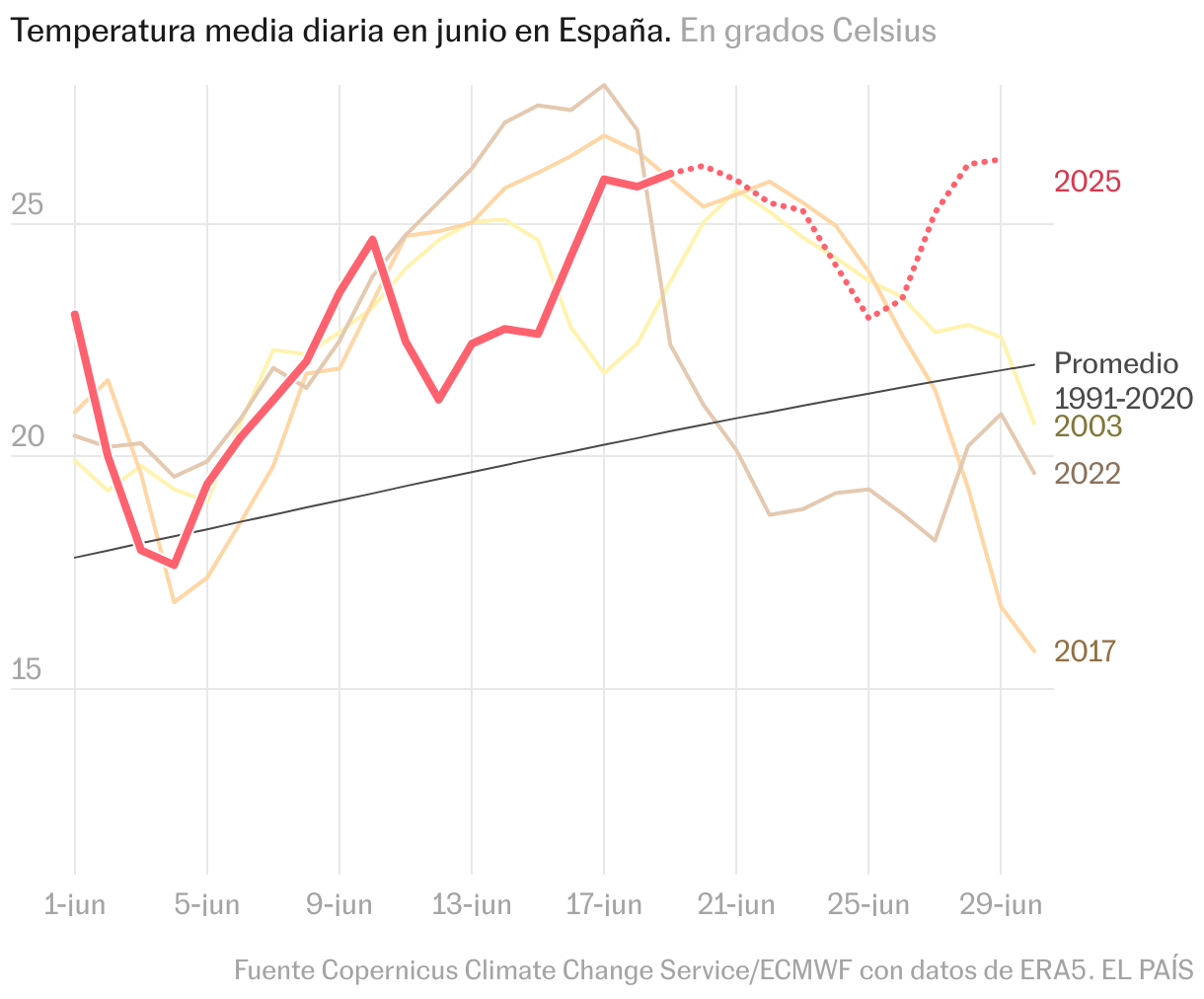 Los anteriores junios más cálidos en España fueron los de 2003 y 2017, prácticamente empatados. Y, curiosamente, ambos están marcados en rojo en la historia del cambio climático y los daños a la salud que causa el calentamiento, como recuerda Del Campo.