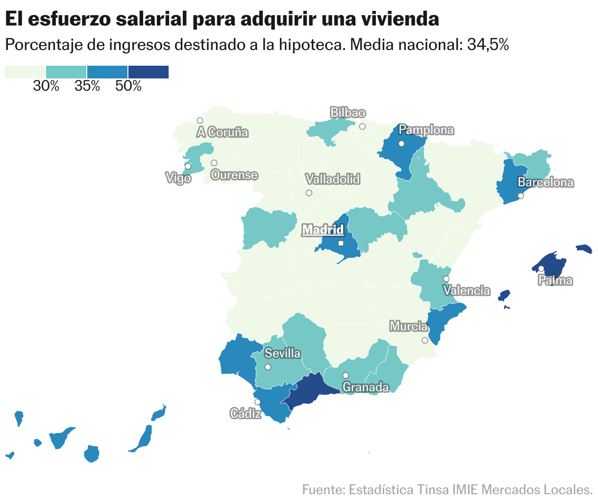 La cuota mensual media de las hipotecas en España es de 711 euros, lo que supone que la tasa de esfuerzo respecto a los ingresos medios se sitúa en el 34,5%. Por encima de ese porcentaje figuran las provincias de Baleares, Málaga, Madrid, Barcelona, Santa Cruz de Tenerife, Cádiz, Navarra, Alicante, Las Palmas, Huelva y Sevilla. Por debajo, pero con al menos un 30%, figuran Guadalajara, Girona, Pontevedra, Almería, Cantabria, Córdoba, Salamanca, Zaragoza y Granada. Valencia, en 21ª posición, tiene un esfuerzo de exactamente el 30%. Además, las dos ciudades autónomas, Ceuta y Melilla, superan el esfuerzo máximo recomendado, lo mismo que sucede en 13 capitales, donde porcentaje pasa del 35%. En cuatro de ellas, se sobrepasa el 50%: Palma, Madrid, Barcelona, y Málaga.