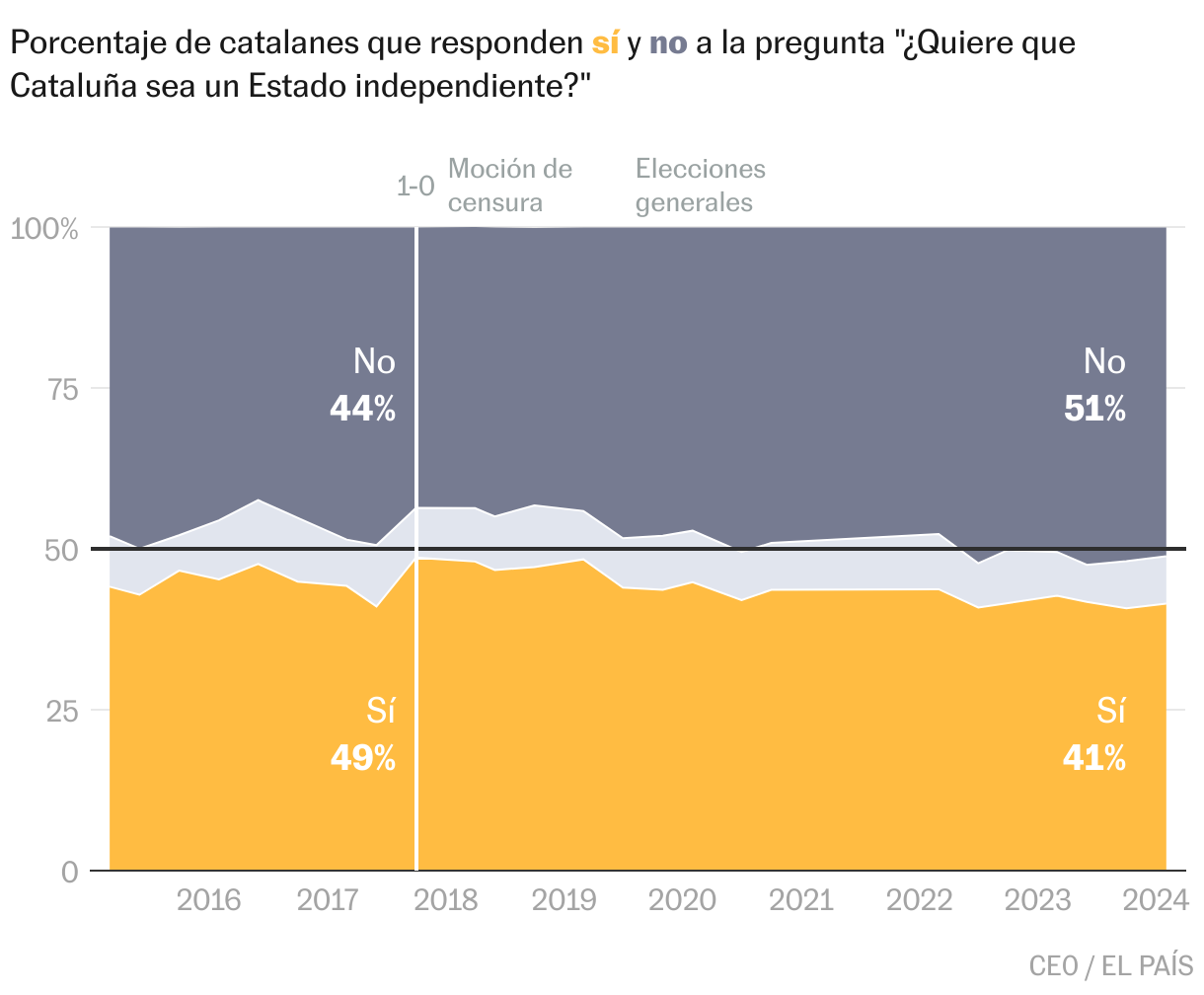 Mientras, la opinión de los catalanes ha ido cambiando: las encuestas del CEO evidencian un retroceso paulatino del independentismo desde octubre de 2017.