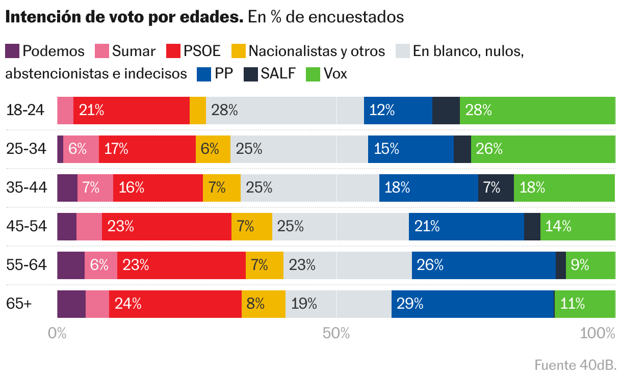 Por edades, el estudio de 40dB. refleja que Vox sigue siendo el partido favorito entre las franjas más jóvenes, con un 27,9% de intención de voto de 18 a 24 años, un 26% de 25 a 34 y un 18% de 35 a 44.