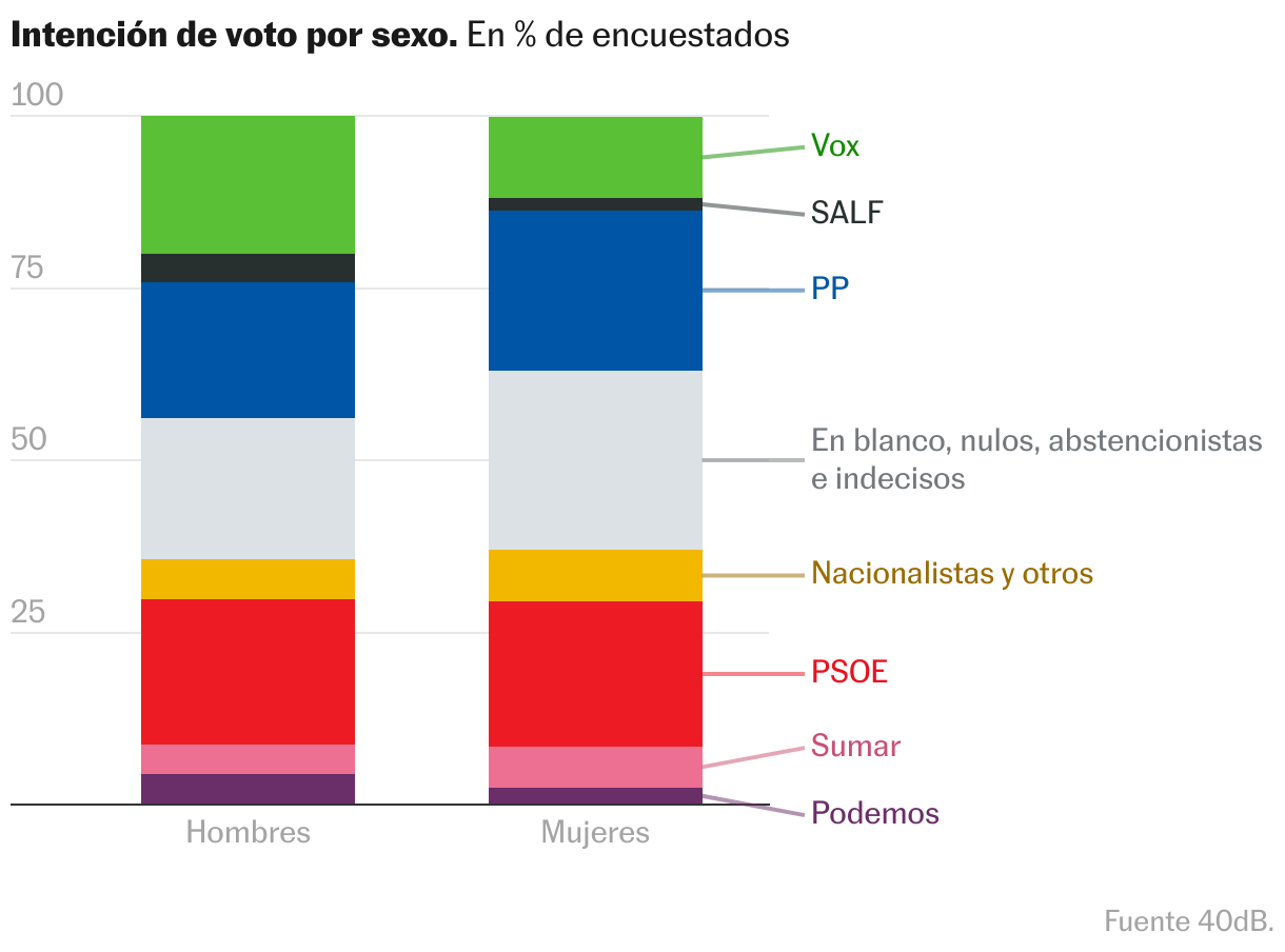 Entre los hombres, el PSOE es el partido que concita más intención de voto (un 21,1%) —dato sin que opere la corrección demoscópica, conocida como cocina—, el mismo porcentaje de apoyo que los socialistas reciben entre las mujeres que, sin embargo, optan más por el PP (un 23,3%). En ambos casos la abstención vuelve a ser muy elevada (la segunda opción del electorado masculino y la primera entre las mujeres), pero no crece respecto al mes anterior. El 21,1% de los hombres se decanta por los socialistas y el segundo partido más respaldado, con el 20%, es Vox. El 19,8% apoya al PP, el 4,4% a Podemos y el 4,3% a Sumar.