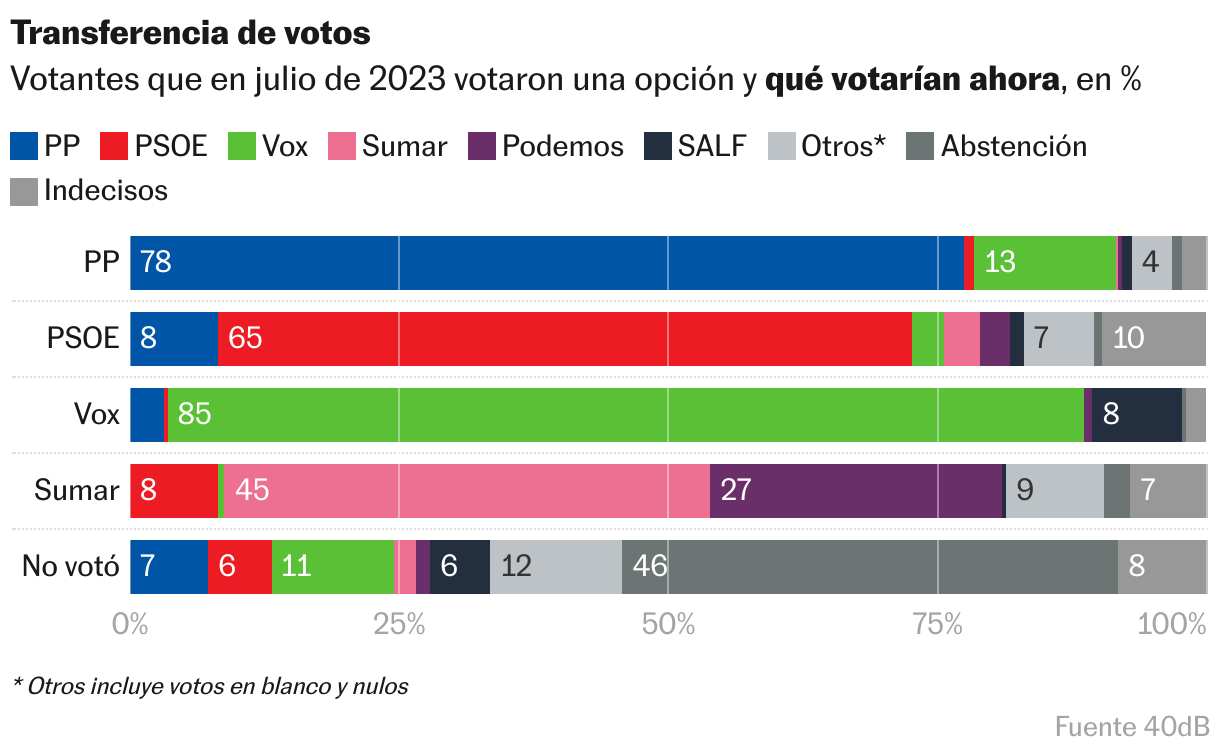 El barómetro de julio sitúa al electorado de Vox de nuevo como el más fiel. Un 85% de los ciudadanos que eligieron la papeleta del partido de Santiago Abascal en las últimas generales lo haría también hoy, seguido del PP (77,5%) y el PSOE (64,5%). En este último caso, el porcentaje es 9,2 puntos menor que el mes anterior. Un 8,2% de quienes apoyaron a Sánchez el 23-J se decantaría ahora por la formación de Alberto Núñez Feijóo y los socialistas acumulan de nuevo la mayor cifra de indecisos (9,7%). El PP sufre sobre todo fugas hacia Vox (13,2% de quienes votaron a los populares en 2023), mientras que los de Abascal experimentan una pérdida del 8,2% de su electorado hacia SALF. Sumar, dividido, solo logra conservar al 45,1% de sus votantes, que se van fundamentalmente a Podemos (27%), un 8,2% al PSOE y un 9% que votaría a otras fuerzas políticas, en blanco o nulo. (Las cifras en los siguientes gráficos están redondeadas).