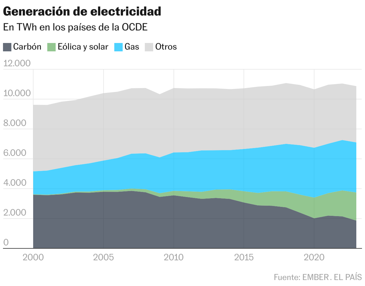 El cierre de Ratcliffe-on-Soar forma “parte de una tendencia global más amplia”, señala Ember, que recalca que la generación de carbón de las naciones de la OCDE alcanzó su punto máximo en 2007. “Y ya se ha reducido a la mitad desde ese punto máximo”, señala Dave Jones, director de perspectivas globales de esta organización. En estos momentos, el carbón representa solo el 17% de la generación de electricidad en los 38 países de la OCDE, frente al 36% en 2007. “El rápido crecimiento de la energía solar y eólica fue responsable del 87% de la caída del carbón durante este período”, añade el informe de Ember.