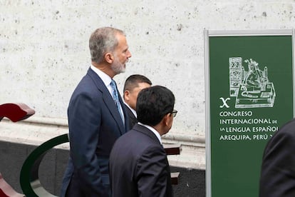 El rey de España, Felipe VI, ha asegurado, en la sesión de inauguración del X Congreso Internacional de la Lengua Española (CILE), que se celebra en Arequipa (Perú), del 14 al 17 de octubre, que esta reunión, con más de 250 participantes, entre académicos de la lengua, escritores, filólogos y ensayistas, es “un ejemplo de comunidad de valores: una conversación en torno a lo que une, no a lo que separa”. En el Teatro Municipal de Arequipa, el Rey ha añadido que este congreso es “una valiosa lección en tiempos en que se oye hablar constantemente de competencia, de rivalidad, de desconexión, de resurgimiento de bloques… de intereses y no de cooperación”. Unas palabras con especial significado en unos días en los que se ha mostrado con toda crudeza el enfrentamiento entre el director del Instituto Cervantes, Luis García Montero, y el director de la Real Academia Española (RAE), Santiago Muñoz Machado.