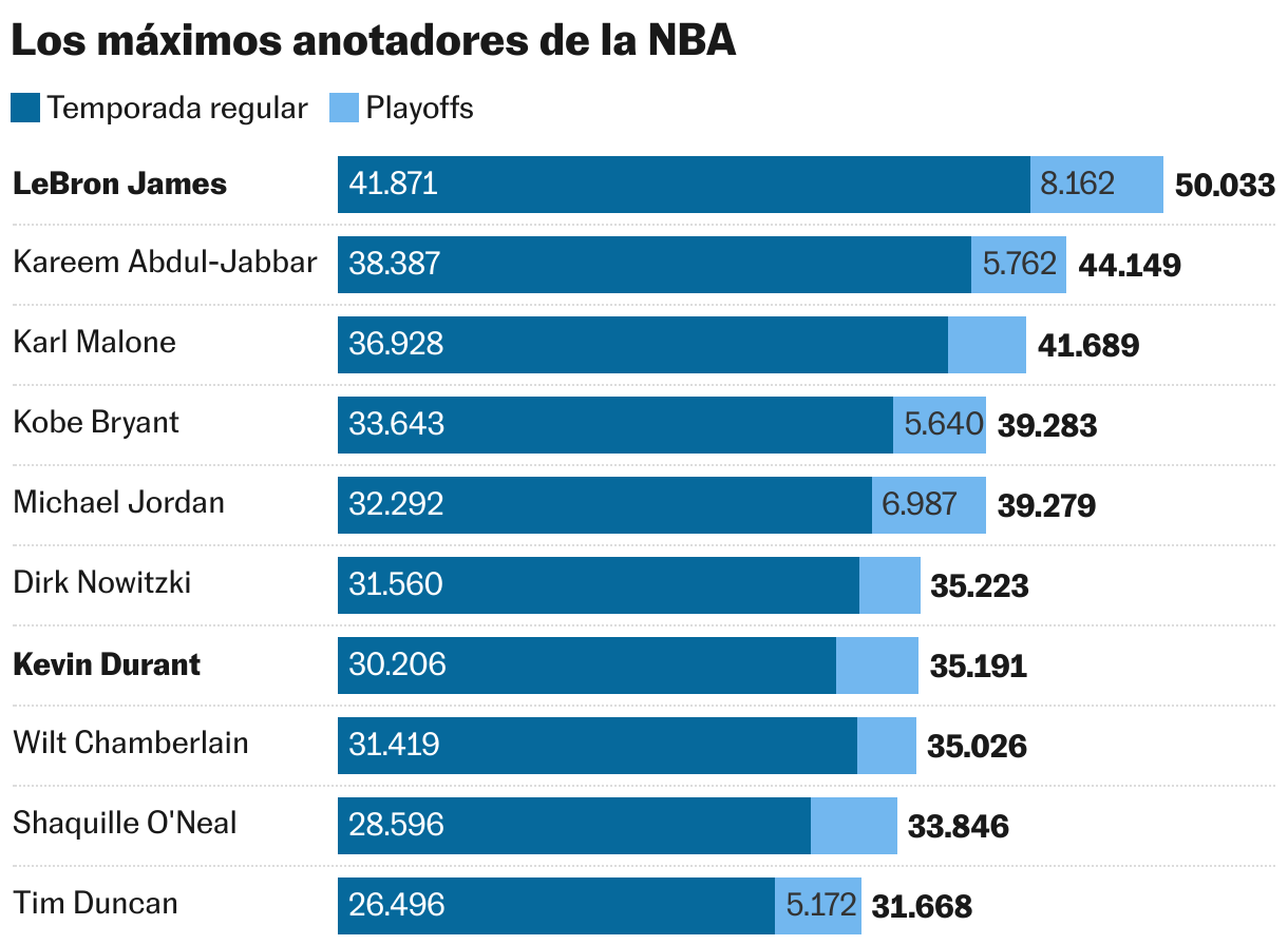 El jugador de los Lakers de Los Ángeles llegaba al partido de este martes con 49.999 puntos, a solo uno del simbólico listón de los 50.000. Acabó anotando 34, con lo que el récord se sitúa provisionalmente en 50.033 y subiendo. En la suma de temporada regular y playoffs, el segundo de la historia es Kareem Abdul-Jabbar (44.149 puntos), seguido por Karl Malone (41.689), Kobe Bryant (39.283) y Michael Jordan (38.279). De los jugadores en activo, el siguiente es Kevin Durant, con 35.191 puntos.
