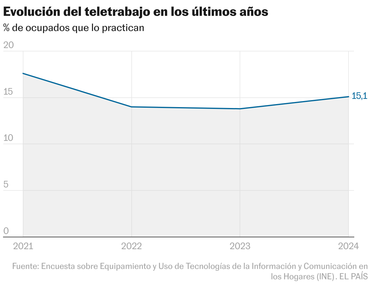 El teletrabajo sigue siendo una fórmula al alcance de muchos trabajadores hoy en día, pese a que los niveles de expansión de esta modalidad que se alcanzaron durante la pandemia han ido marchitándose progresivamente desde entonces. De acuerdo con la última Encuesta sobre Equipamiento y Uso de Tecnologías de la Información y Comunicación (TIC) en los Hogares publicada este jueves por el Instituto Nacional de Estadística (INE), el porcentaje de ocupados que teletrabajan se ha incrementado ligeramente en el último año —1,3 puntos porcentuales, concretamente—, hasta representar el 15,1% del total de los trabajadores (algo más de cuatro millones, según el último conteo de la EPA). La media de días que estos no acudieron a su centro de trabajo fue de 3, prácticamente los mismos que el año anterior, en una estadística que apenas ha variado en los últimos ejercicios.