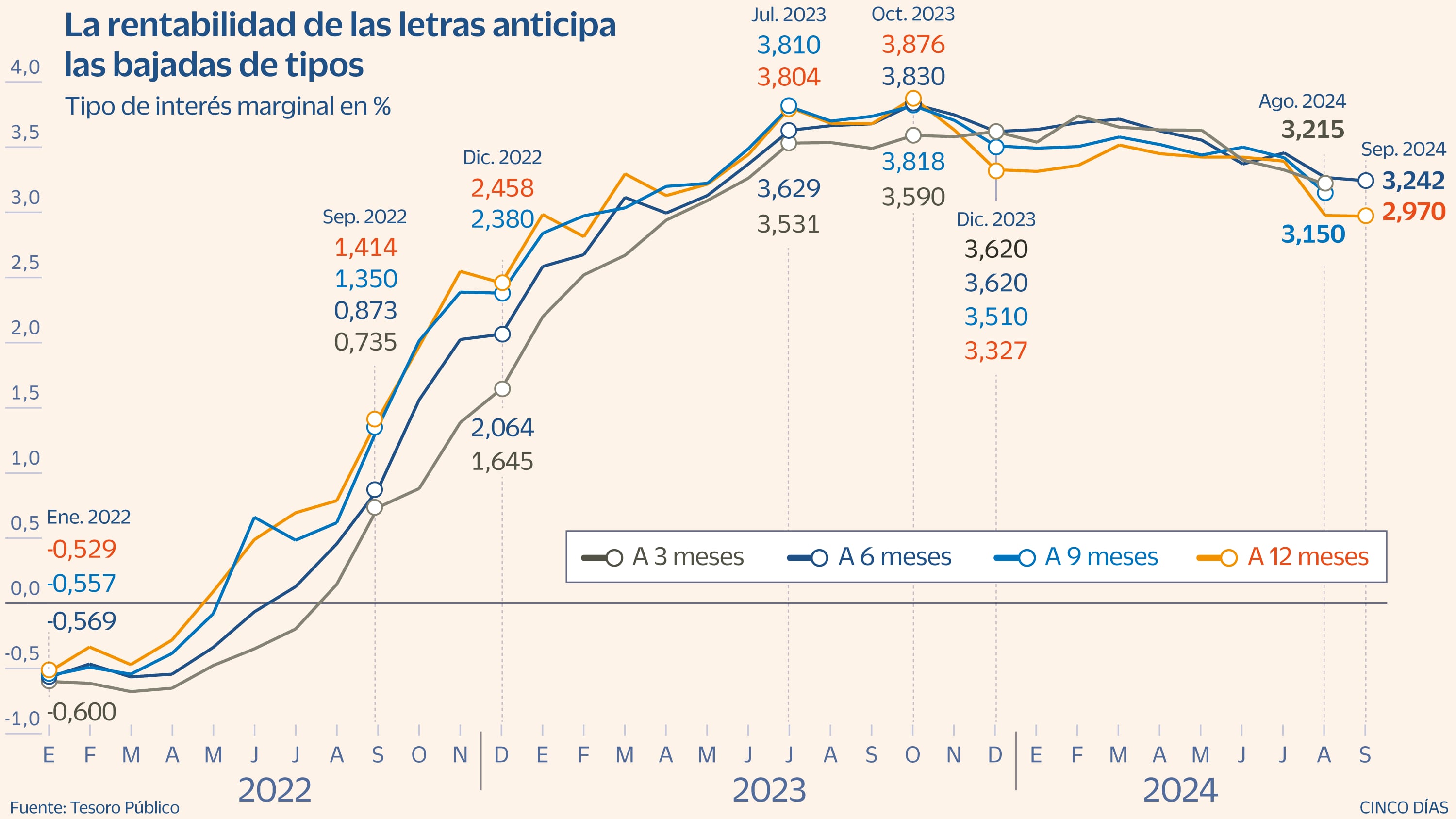 El paulatino descenso de la rentabilidad que paga el Tesoro por las letras se está comenzando a reflejar también en la demanda registrada en la subasta. En un momento en que el mercado ya sabe que los tipos de interés van a bajar -no solo en la zona euro sino en EE UU, según ha confirmado el presidente de la Fed de cara a la reunión del próximo día 18-, los inversores en renta fija se están empezando a plantear el movimiento hacia deuda a plazos más largos. Al menos hacia tipos medios, de tres o cinco años, que dejen menos expuesta su inversión llegado el vencimiento, Así, quien compre ahora una letra a seis o doce meses se va a encontrar irremediablemente con rendimientos más bajos cuando venza su inversión, lo que da más atractivo a invertir en plazos más largos para asegurar más rentabilidad.