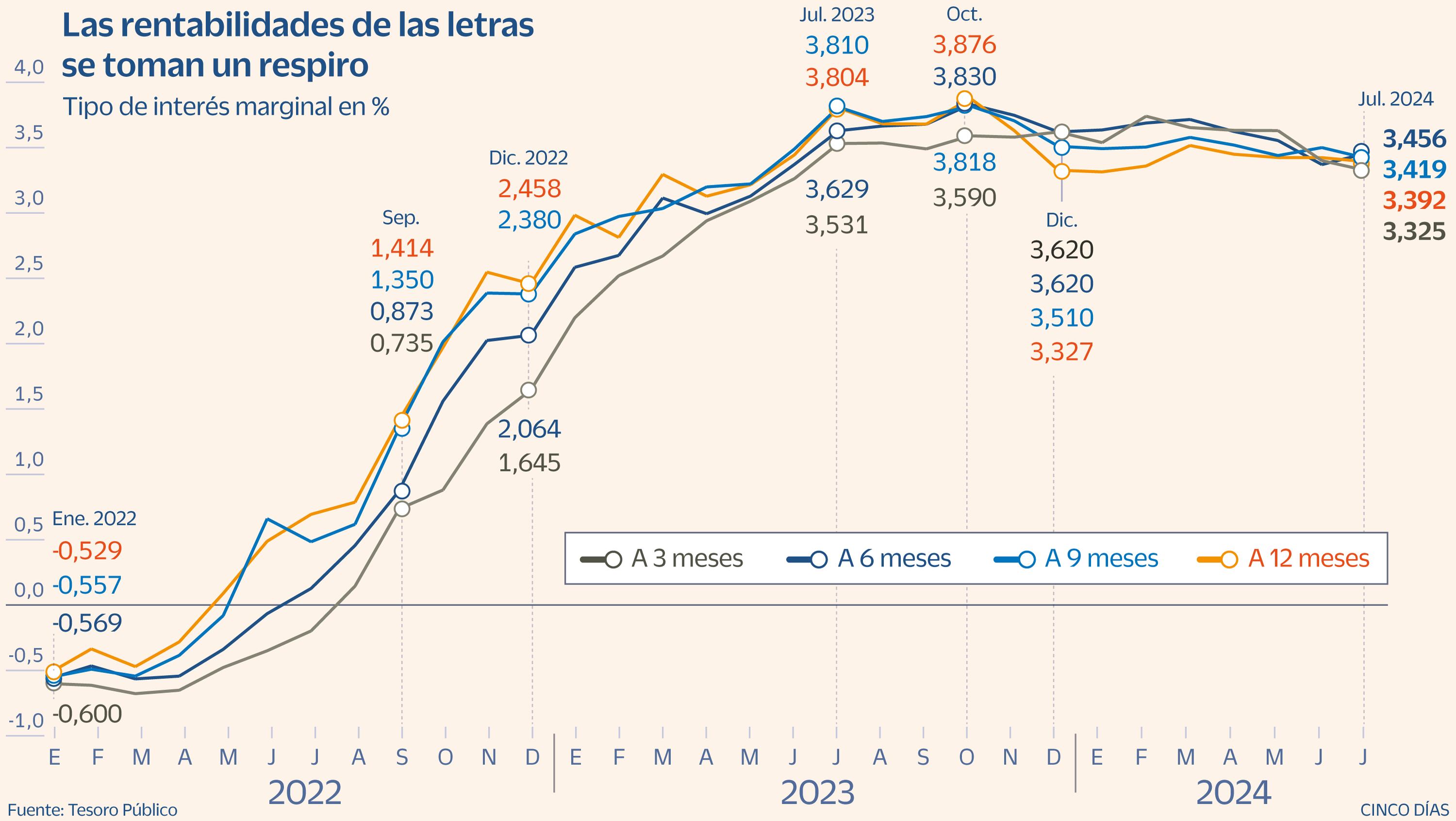 El grueso de la operación, 1.288,31 millones, correspondió a las letras a nueve meses. La rentabilidad marginal bajó del 3,5% de la puja de junio al 3,419%, el tipo más bajo desde mayo de 2023. En letras a tres meses se adjudicaron 743,2 millones de euros al 3,325%, por debajo del 3,4% previo y el tipo más bajo desde en un año. Los rendimientos que ofrece la deuda seis y a nueve meses son los más atractivos.