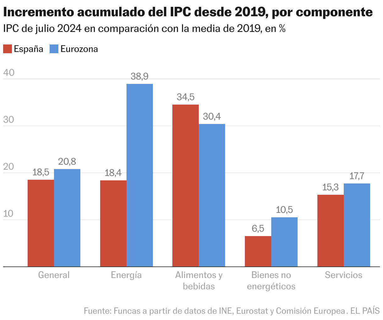 La preocupación procede ahora de los servicios: en estos sectores, la inflación está siendo más resiliente, situándose en torno al 3,5% en España e incluso acelerándose por encima del 4% en el conjunto de la eurozona. El impulso no proviene de los costes de producción o del shock energético, sino de la pujanza de la demanda, exacerbada por la falta de competencia que caracteriza estos sectores en comparación con la presión feroz a la que se ve sometida la industria manufacturera en los mercados internacionales. Desde 2019, el IPC de servicios acumula un incremento cercano al 18%, un ritmo que casi triplica la inflación de los bienes industriales no energéticos, siendo además estos últimos los más perjudicados por la crisis energética y de suministros.