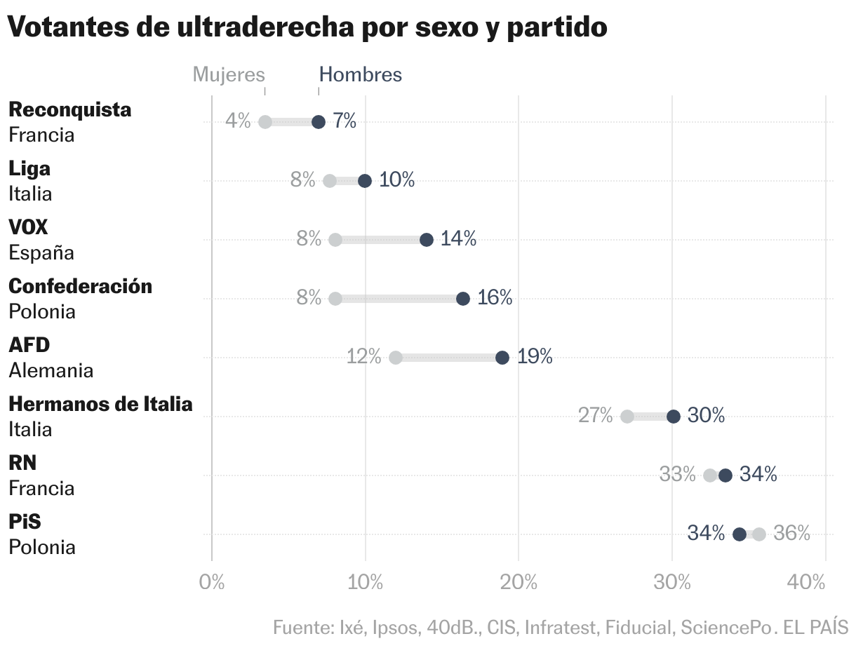 Una estrategia similar usó el partido de ultraderecha Alternativa para Alemania (AfD). Maximilian Krah, anterior cabeza de lista de la formación, que fue expulsado tras rebajar la responsabilidad de las SS nazi en el Holocausto, subía vídeos en campaña dando “consejos” a los jóvenes. En particular a los hombres. “Uno de cada tres jóvenes alemanes nunca ha tenido novia ¿Eres uno de ellos? No veas porno, no votes a Los Verdes (…). Los hombres de verdad se sitúan en la extrema derecha. Los hombres de verdad son patriotas. ¡Esa es la manera de encontrar novia!”, decía en una publicación. El factor de género cumple un rol importante para las formaciones extremistas: en los cinco países analizados, ellos se inclinan a votar por estos partidos más que ellas.