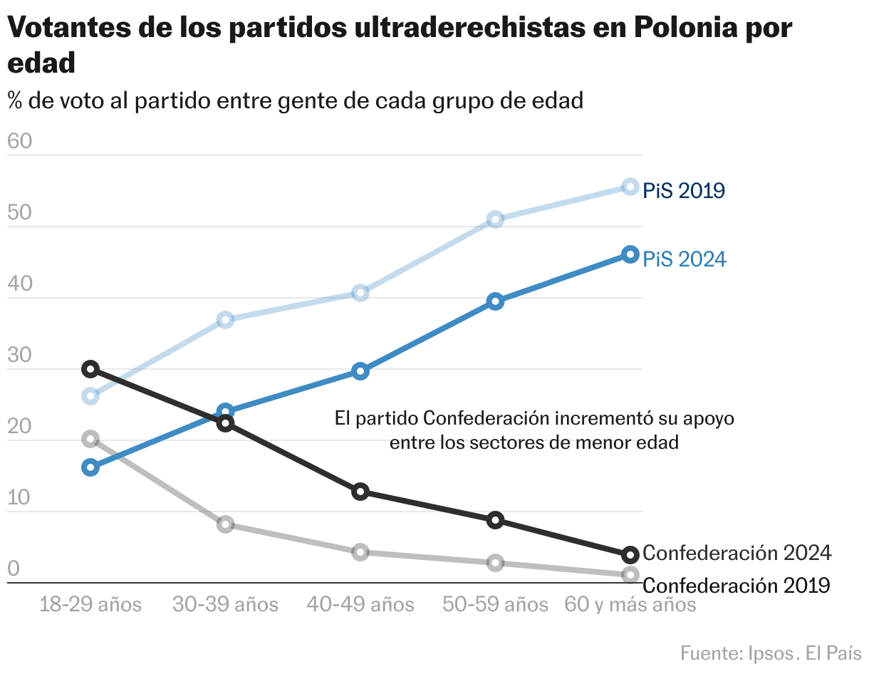 En Polonia, quinto país de la UE por población, los jóvenes han dejado de respaldar a los ultraconservadores de Ley y Justicia (PiS) y ahora se inclinan por una opción aún más escorada a la derecha: Confederación, partido fundado en 2018. Las propuestas económicas ultraliberales de esta formación euroescéptica y populista atraen cada vez más a los jóvenes. Un 30% los apoyó el 9-J, en detrimento del PiS (16,2%) y es de lejos el ganador en este grupo de edad. Hace un lustro, el PiS recabó el mayor número de apoyos en todos los grupos de edad. Entre los más jóvenes, recibió el 26,2%, unos 10 puntos por encima de los que obtuvo entonces Confederación.