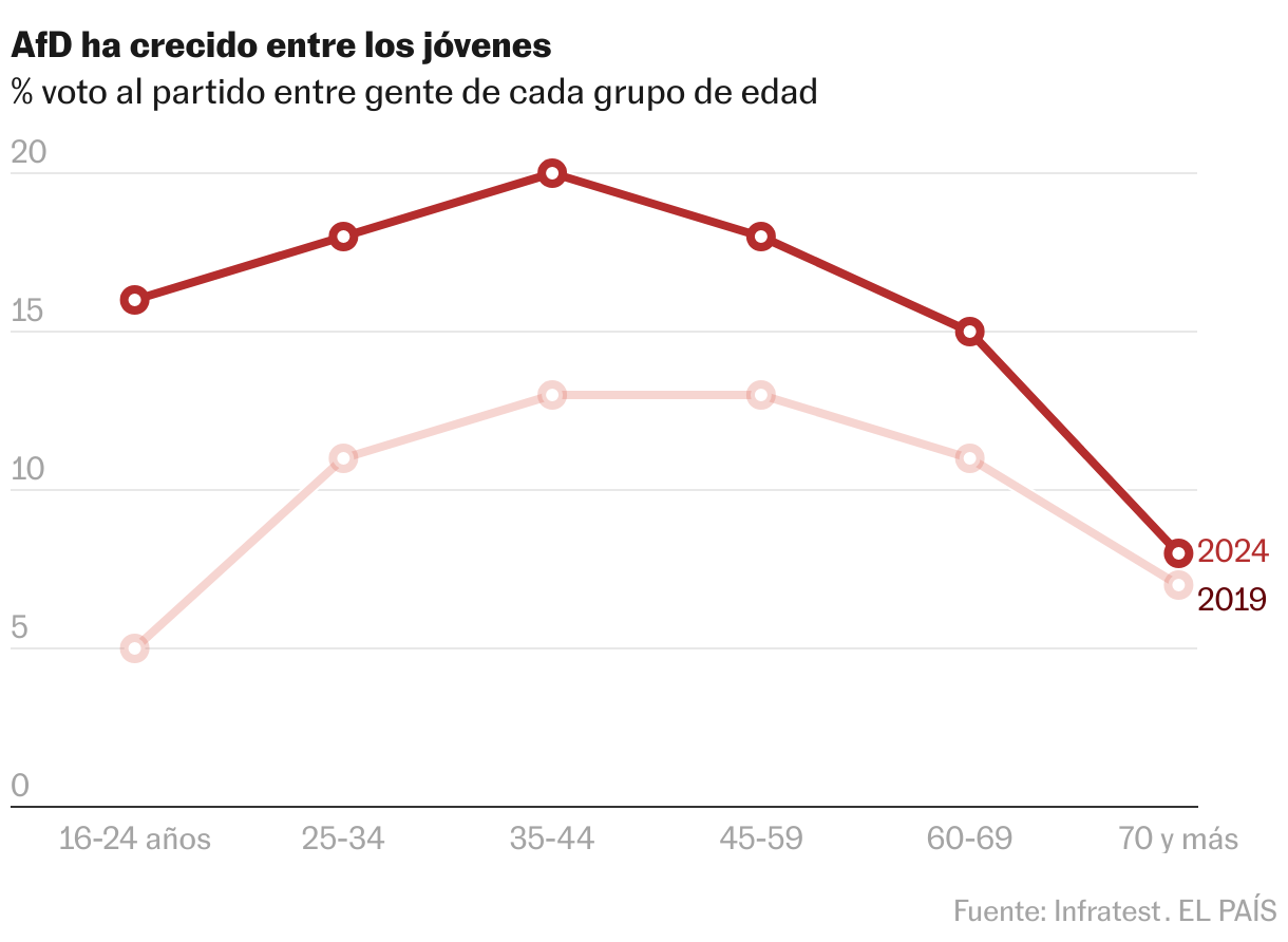 A pesar de los escándalos que iba acumulando, uno tras otro, esta formación, AfD resultó como segunda fuerza el 9-J, solo por detrás de los democristianos (CDU) y levemente por encima de los socialdemócratas, formación del canciller, Olaf Scholz. Por primera vez, los alemanes podían votar a partir de los 16 años, una reivindicación que defendía el partido de Los Verdes —miembro de la coalición de Gobierno, junto a los liberales—, que recibió un importante respaldo de los jóvenes en 2019 (34%). Sin embargo, su apuesta falló estrepitosamente, ya que se quedó con tan solo el 11% del apoyo joven. Este grupo de edad se inclinó por la CDU (17%) y por AfD (16%; son 11 puntos más que en 2019), además de partidos minoritarios como Volt y Die Partei.
