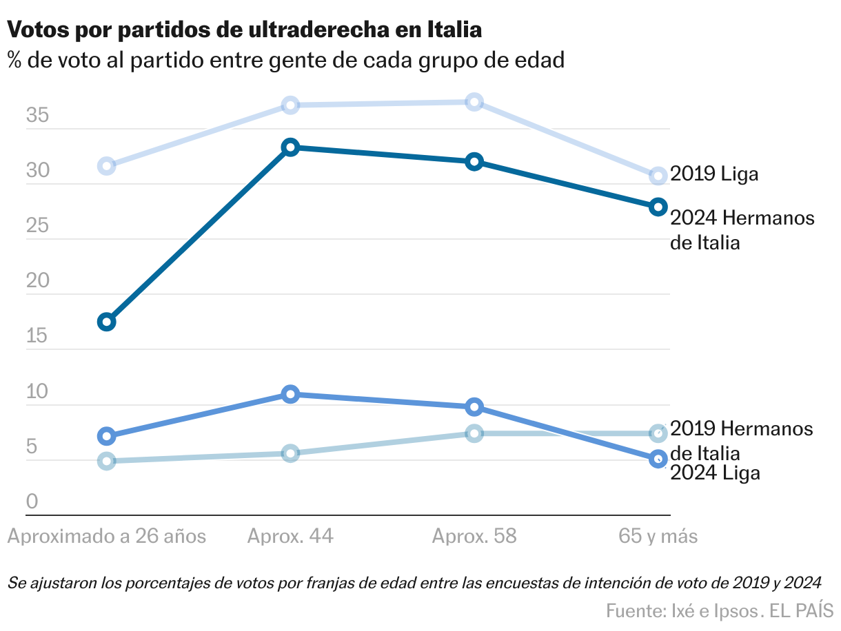 En Italia se registra una tendencia similar. Hermanos de Italia, partido de la primera ministra, Giorgia Meloni, pasa del 4,9% al 17,3% de los sufragios entre los votantes jóvenes (La Liga, de su socio de coalición, Matteo Salvini, sí muestra pérdidas importantes). Durante su campaña para las europeas, Meloni se mostró más moderada para apelar a los indecisos y para conseguir que el Partido Popular Europeo pusiera en duda el cordón sanitario para pactar con los ultras en asuntos puntuales en la próxima legislatura (la formación italiana encuadrada en los populares europeos, Forza Italia, ya gobierna en coalición con el partido de Meloni).