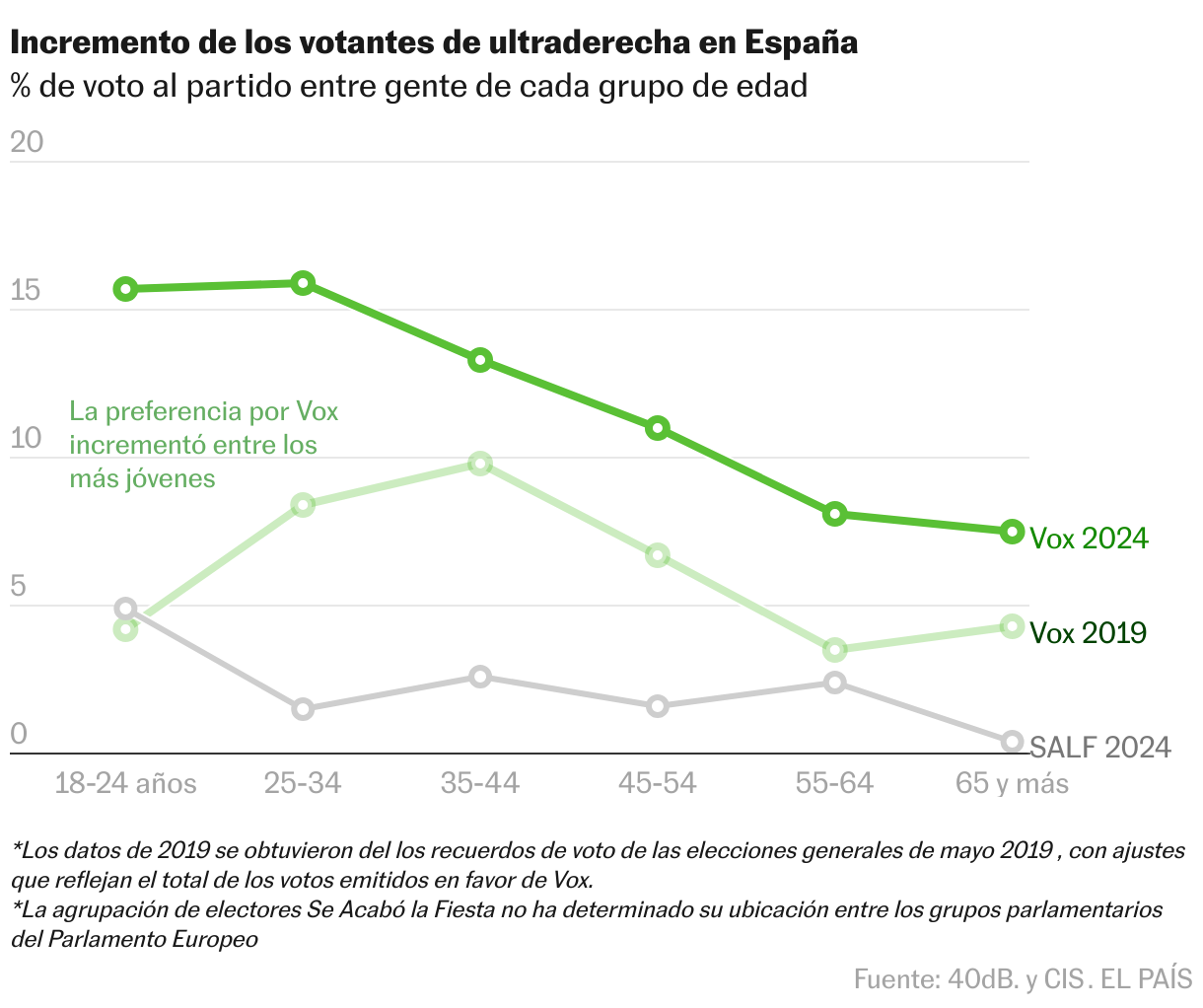 La popularidad de la extrema derecha entre los jóvenes tiene sus límites. Italia y España son un ejemplo de ello. En España, Vox crece con fuerza. El 9-J recibió un 15,7% del voto joven. A falta de datos desagregados de las europeas de 2019, sirve de referencia para mostrar la subida el resultado de las generales de abril de ese año, en las que el partido solo logró el 4,2% de apoyo en ese grupo de edad. A este auge ultra en España se ha sumado un nuevo actor: Alvise Pérez, fundador de Se Acabó La Fiesta (SALF), que se metió a la Eurocámara con tres eurodiputados, con más adeptos entre el grupo de menores de 25 años.