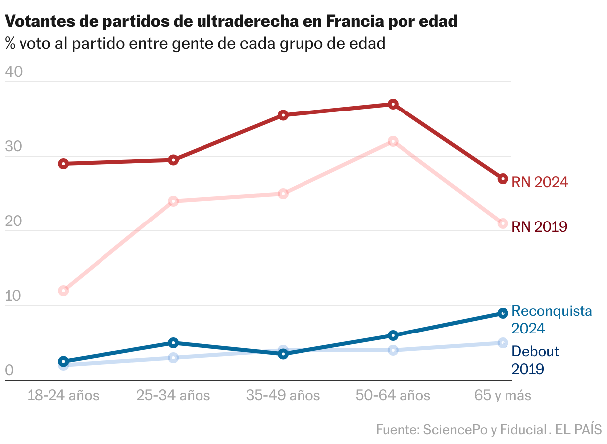 La expansión de los ultras es evidente en Francia. El Reagrupamiento Nacional (RN) de Marine Le Pen consiguió uno de cada tres votos en los comicios europeos, muy por delante del partido del presidente Emmanuel Macron, y su triunfo provocó un adelanto de las elecciones legislativas. La popularidad de RN es transversal por edad, pero el avance entre los jóvenes es significativo: en 2019, solo el 12% de los franceses de entre 18 a 25 años votaron por Le Pen; ahora esta cifra llegó al 29%.