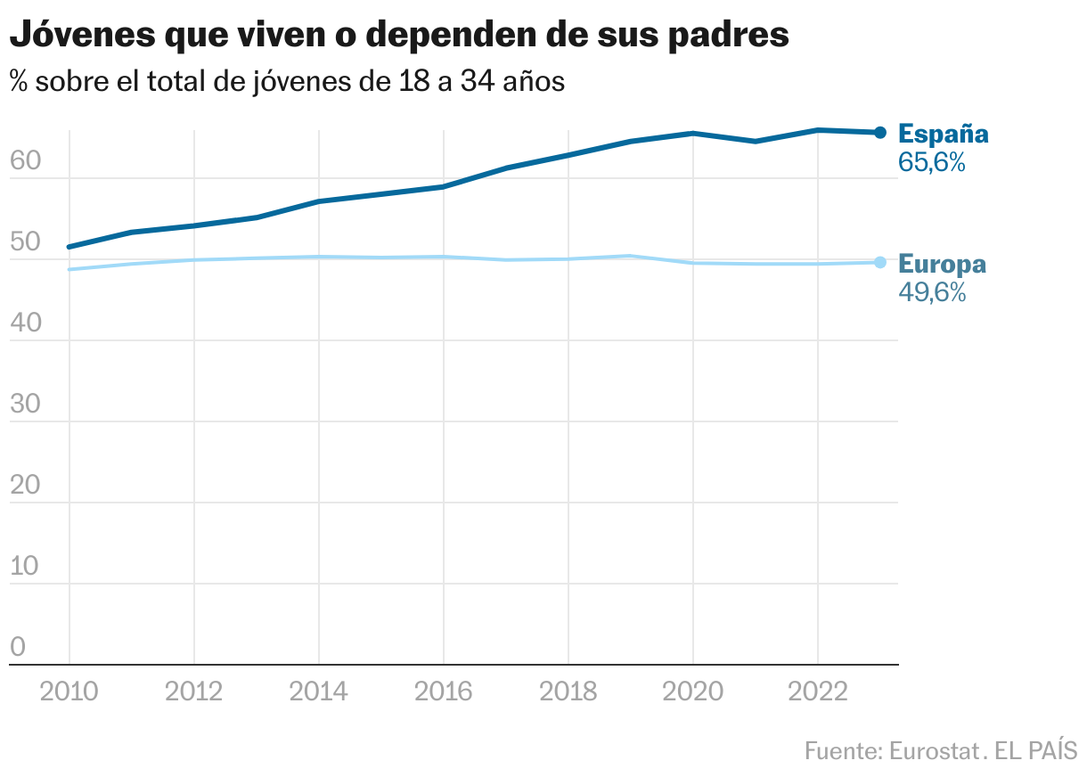 Una persona que ha salido de la casa de sus padres cumple la condición básica para engrosar las cifras de emancipación, pero el responsable del área socioeconómica del CJE, Javier Muñoz, pone en duda la conveniencia del término. Se pregunta si se puede considerar enteramente independiente a alguien que se ve obligado a compartir vivienda, depender de ayuda, tener un trabajo precario o ahorros prácticamente nulos. “Al final, esa persona no es libre porque está sometida a condiciones materiales que no le permiten desarrollar su proyecto de vida”, reflexiona. A su juicio, la asistencia de terceros se ha ido prolongando, en gran medida, debido a “una pérdida tremenda de poder adquisitivo” para los jóvenes, ocasionada por la subida de los precios, en especial en el mercado de la vivienda, y a unos salarios que no avanzan en la misma medida.