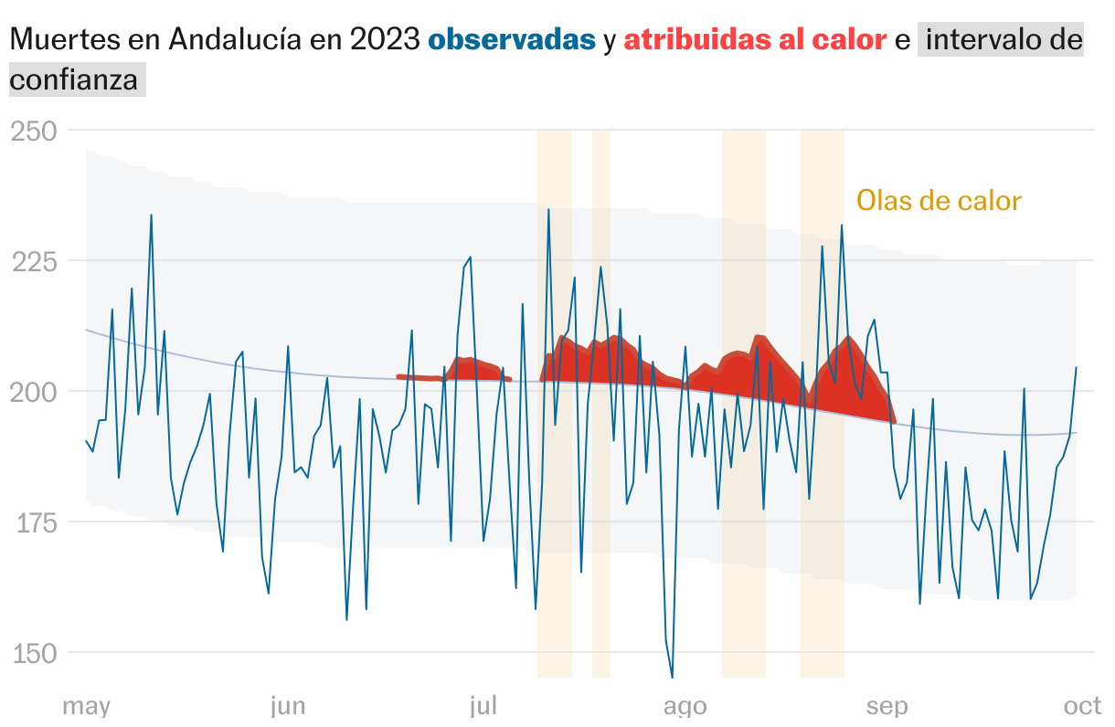 Como detalla Julio Díaz, investigador del Instituto de Salud Carlos III y uno de los especialistas que trabaja con estadísticas de defunciones atribuibles al calor, estas estimaciones se realizan a partir del exceso de fallecimientos que se produce cuando las temperaturas superan determinados niveles (o cuando bajan de determinados niveles, en el caso de las muertes por frío) en comparación con los valores normales de los registros históricos. No se trata de una contabilización de muertes reales, sino de una estadística extraída de un aumento de los decesos que sí es muy real. “Solo entre un 2 y 3% de estos fallecimientos por altas temperaturas tienen que ver con golpes de calor”, subraya el investigador, que explica que la inmensa mayoría de las muertes relacionadas con el ascenso de los termómetros son por el agravamiento de otras enfermedades. Según las estadísticas de MoMo, esto afecta de forma especial a personas de edad muy avanzada, pues dos terceras partes de los 3.009 decesos estimados el año pasado corresponden a mayores de 85 años. En lo que respecta a la incidencia geográfica, las comunidades autónomas donde salieron más fallecimientos atribuibles a esta causa fueron Madrid (409), Andalucía (397) y Galicia (307).