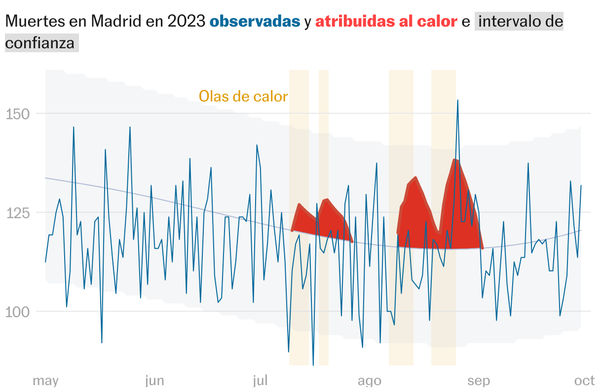 Al igual que ocurre con las muertes por contaminación atmosférica, donde se conocen todavía menos casos reales, sin las estadísticas estos fallecimientos por el calor pasarían desapercibidos, ocultos por otras patologías, lo que no ayuda a que la sociedad sea más consciente del riesgo de las altas temperaturas para la salud. “Nosotros utilizamos estudios ecológicos, que no pueden decir si un individuo ha muerto por el calor, pero sí permiten analizar la incidencia en poblaciones enteras”, comenta Díaz sobre los modelos estadísticos. Aunque no se conozcan los casos reales, el investigador explica que sí se puede establecer una relación causa-efecto con las temperaturas y los fallecimientos, dado que se cumplen determinadas condiciones, como la existencia de una asociación estadísticamente significativa, que se haya constatado en diferentes lugares del mundo, que exista un mecanismo biológico que lo explique y que se haya comprobado una correspondencia dosis-respuesta, de forma que según aumentan los grados de calentamiento también se incrementan los decesos. “El calor es fulminante”, recalca Díaz. “Las muertes se producen normalmente uno, dos, tres y hasta cuatro días después de un aumento de las temperaturas. Puede ser un viejecito que está en su casa a 38 grados, no se hidrata, se descompensa, le llevan al hospital y se muere a los tres días”. Hoy en día resulta muy complicado que en su certificado de defunción aparezca alguna referencia al calor, pero sí será un número que saltará en las estadísticas.