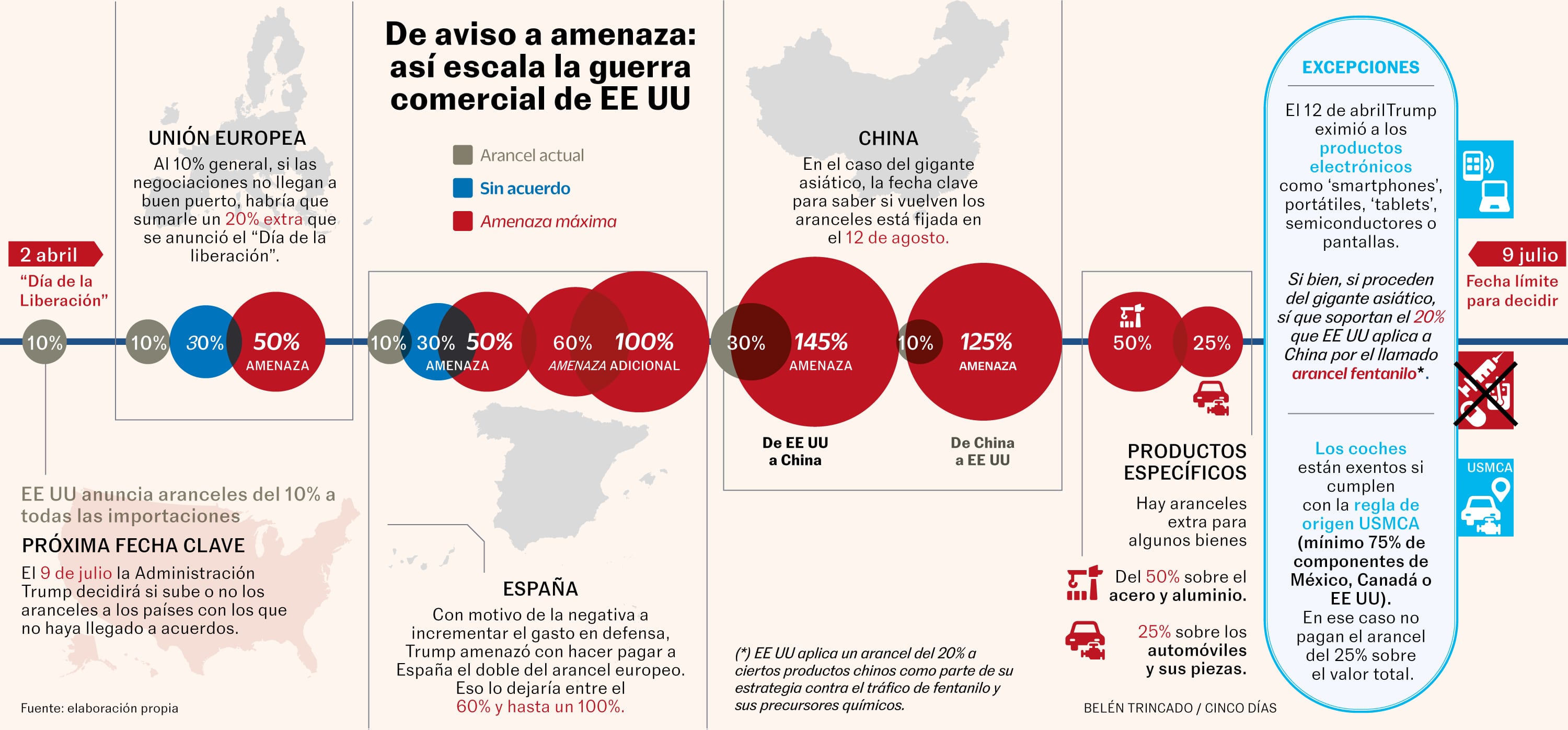 A falta de escasos días para el 9 de julio, fecha en la que en teoría acaba la tregua arancelaria, el escenario es todavía incierto. El viernes, el presidente de EE UU anunció el envío de cartas a diferentes países para comunicarles los nuevos aranceles que soportarán, pero el contenido y el alcance final de las cartas es, a cierre de esta edición, una incógnita. En la actualidad, todos los bienes importados por Estados Unidos soportan un arancel de como mínimo el 10%. Si no hay acuerdos, pronto la Unión Europea podría ser impactada por un gravamen que podría elevarse hasta el 50%. En el caso de España, se desconoce si el castigo comercial podría ser mayor.