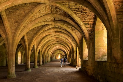 Hoy son los turistas quienes se adentran en el interior de estas ruinas laberínticas y juegan a identificar los puntos desde los que las dibujó Turner. Uno de ellos se encuentra donde la nave principal de la iglesia hace la cruz, justo en frente de una torre. Acuarela en posesión de un coleccionista privado. Aunque impacta más ver que el suelo de esa nave descapotada es una capa de hierba cortada al ras con el aspecto de una piscina olímpica de unas cuatro calles. Esa misma nave central, a la altura de su entrada principal, se comunica con el cellarium, un gran espacio alargado de techo bajo arqueado que en su día era la despensa. A través de sus ventanales se ve lo que queda en pie del claustro y el refectorio. En el extremo opuesto, anexo al mismo, se encuentran los retretes. Espacios verticales similares en forma y tamaño a un ataúd y encarados al río. Desde los mismos se ven las construcciones que albergaban los almacenes de lana, la panadería y la cervecería. Dentro del recinto religioso, debajo de lo que era la casa del abad, había una pequeña cárcel. Se conserva el anillo de hierro que servía para mantener encadenados a los presos. La abadía se convirtió en ruinas a raíz de la orden de disolución de Enrique VIII y volvió a florecer a mediados del siglo XVIII cuando William Aislabie, terrateniente y político, la compró para encajarla y completar su jardín acuático Studley Royal. El conjunto que forman está declarado patrimonio mundial de la Unesco desde 1986 y en la actualidad es propiedad de la entidad National Trust.