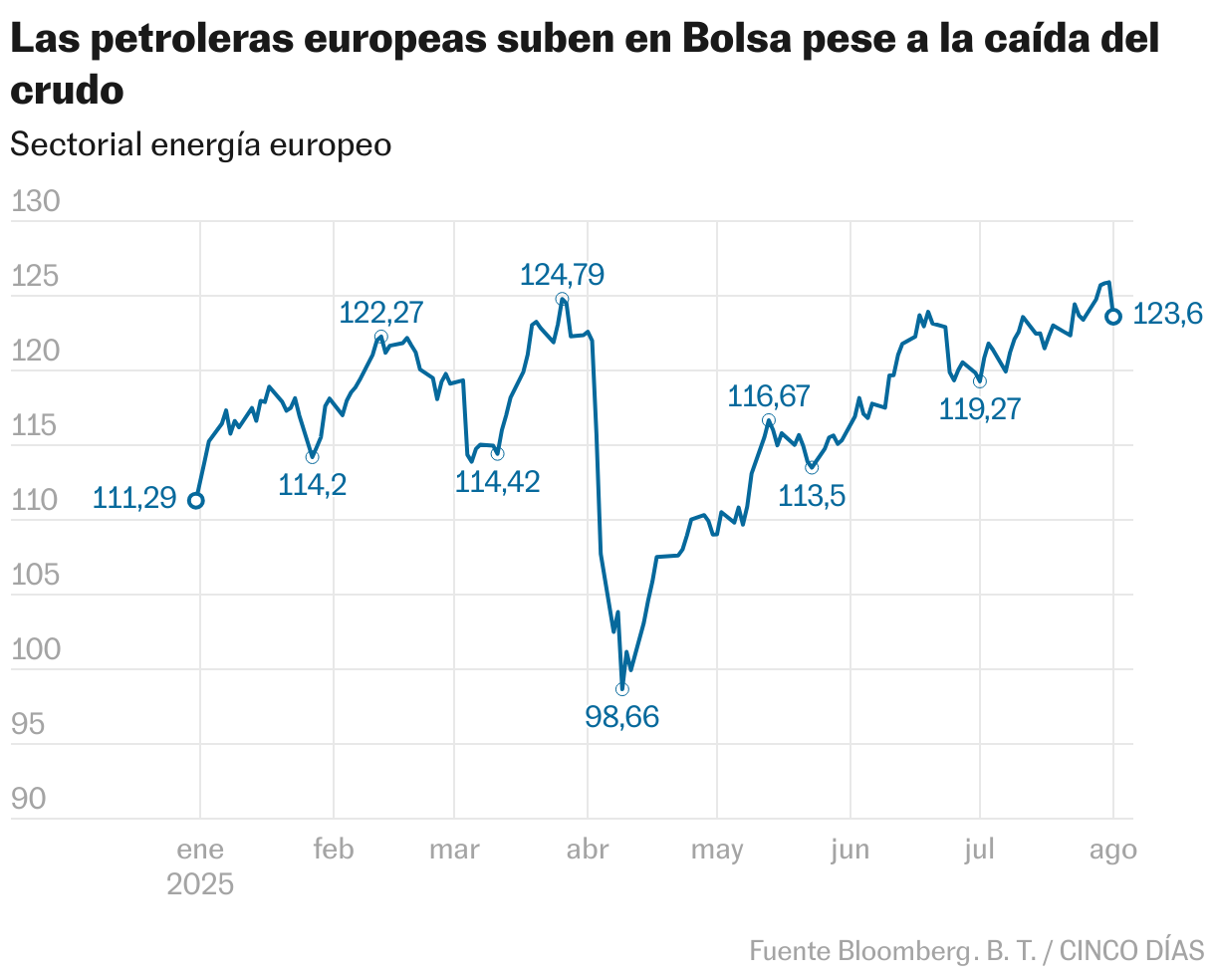 La geopolítica y la cotización de las petroleras y gasistas va inevitablemente de la mano. Este mismo lunes, las estadounidenses Venture Global, Cheniere Energy y NextDecade (especialistas en gas natural licuado) se dispararon cerca del 8% al conocer la cláusula energética incluida en el pacto de aranceles entre EE UU y la UE. “Aunque las ventas de energía acaben siendo inferiores, Estados Unidos está asegurando a sus gasistas que van a tener demanda. Y a las petroleras europeas enfocadas en el refino de petróleo, también les vendrá bien”, añade Amor.