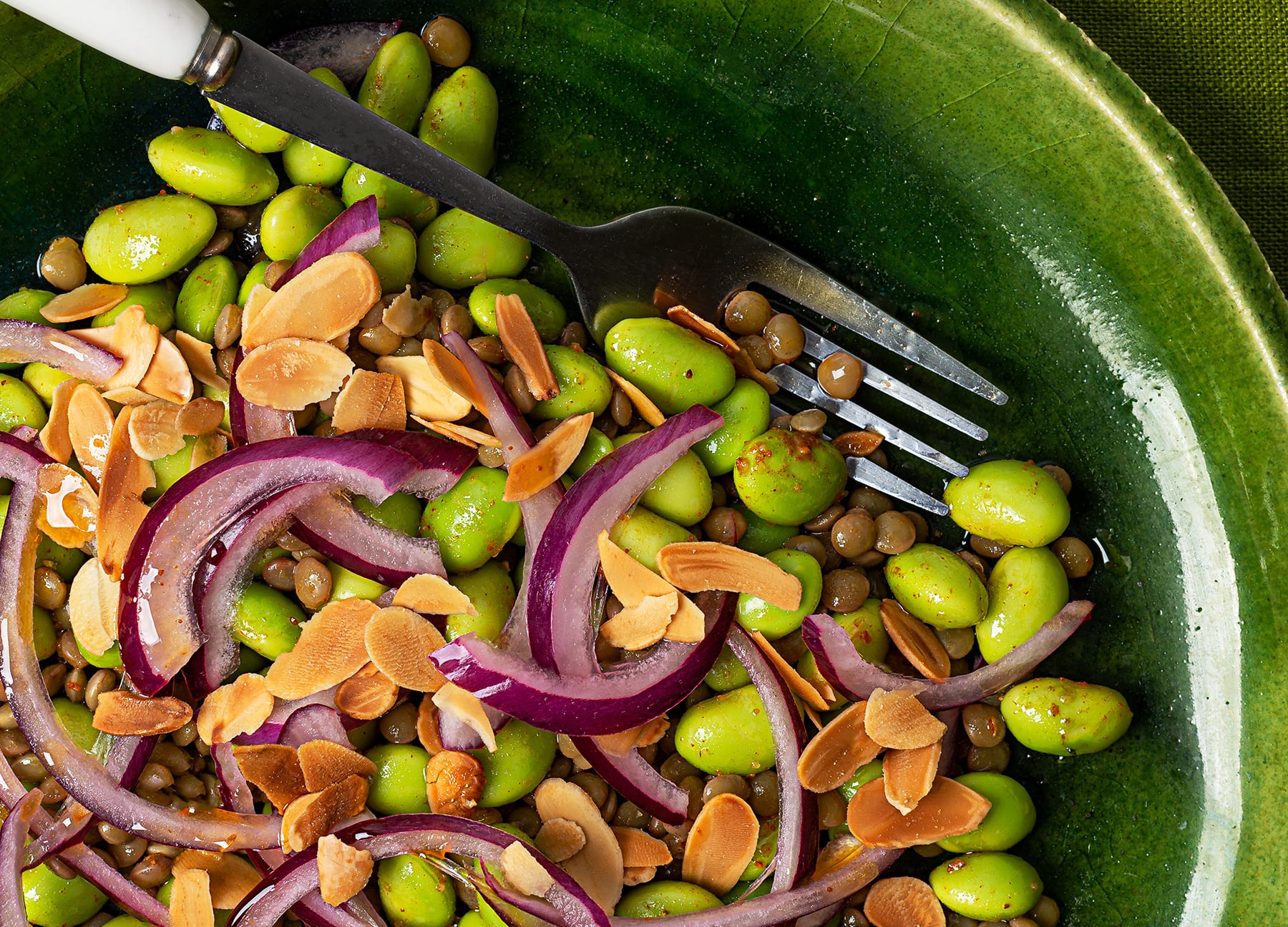 En una ensaladera, mezclar las lentejas bien escurridas de su caldo de cocción, los edamame desgranados y la cebolla escurrida. Aliñar con la vinagreta y remover para que se impregne toda la ensalada. Espolvorear con las almendras tostadas y servir.