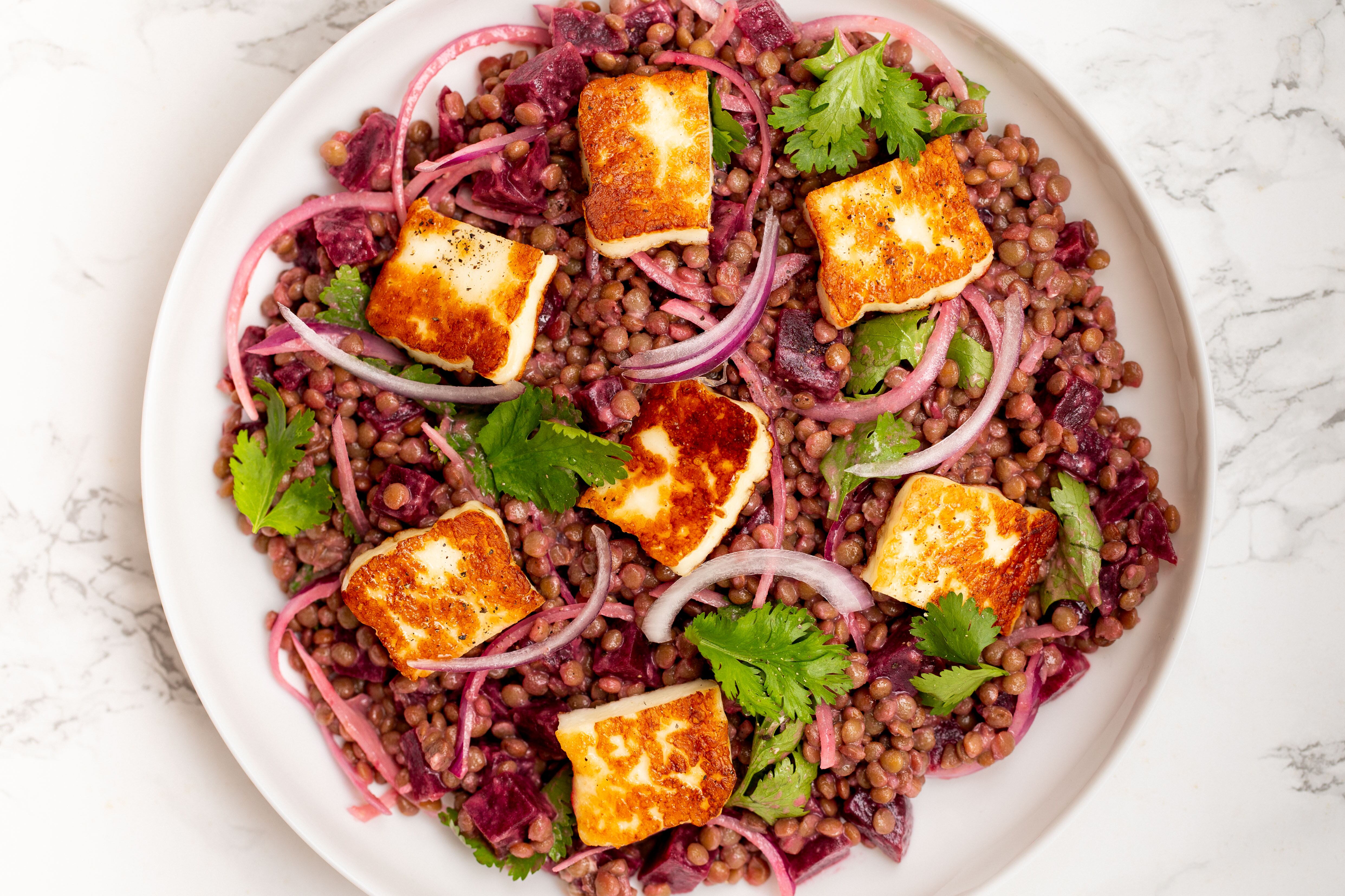 Esta ensalada en particular lleva lentejas como base, que bien puedes comprar ya cocidas o cocer tú en casa con poco esfuerzo, remolacha –también puedes comprarla ya cocida y envasada–, cebolla morada, halloumi a la plancha y cilantro. ¿No tienes este queso chipriota a mano? Sustitúyelo por un par de huevos duros y quedará perfecta también. Si le quieres añadir más chicha, un poco de arroz integral o quinoa le vendrían muy bien.