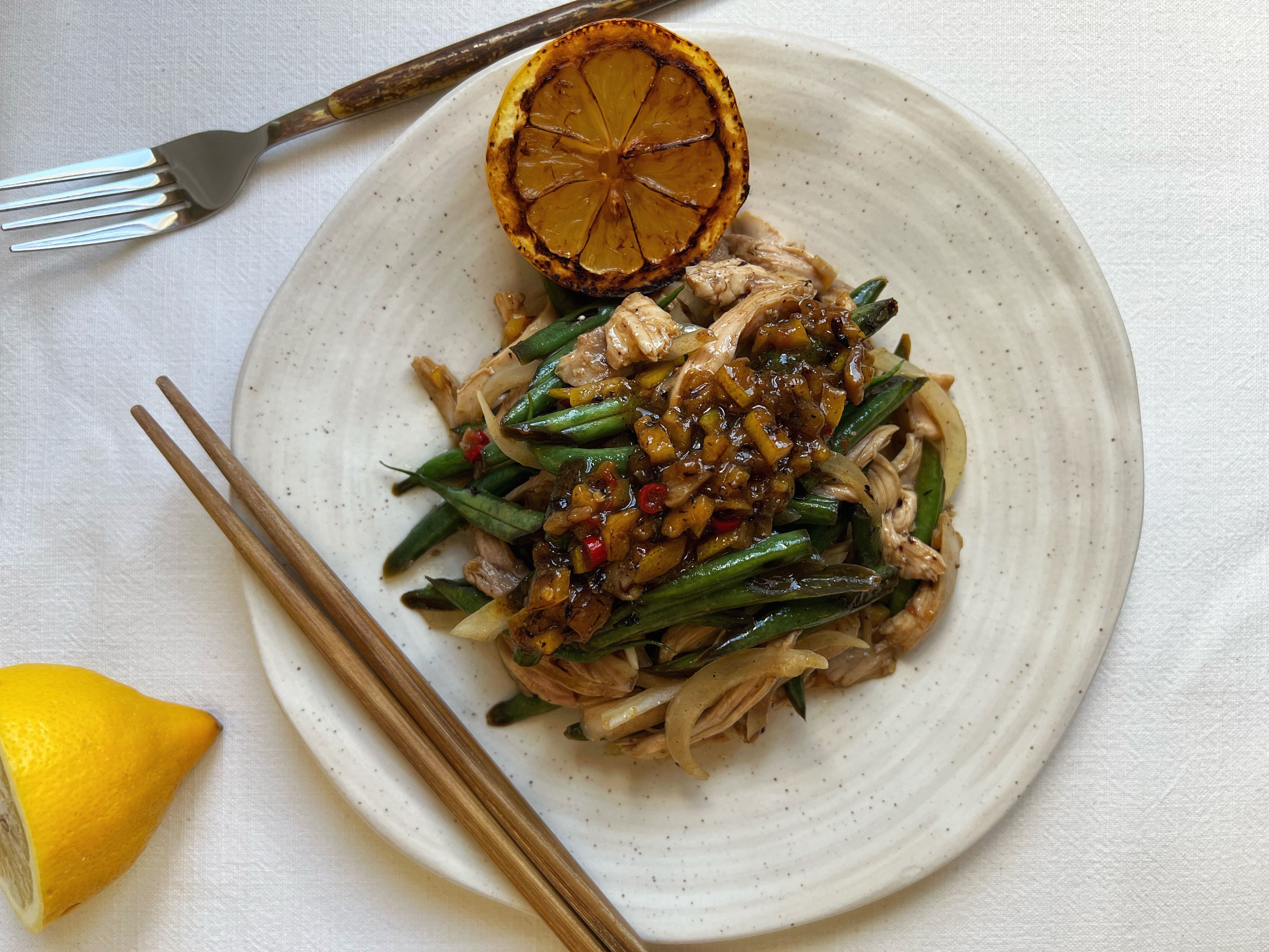 La gracia de esta receta se encuentra, principalmente, en la vinagreta. El limón, como fruta cítrica que es, carameliza si lo cocinamos a fuego medio-fuerte. Unas rodajas de limón tostadito y bien picado darán carácter a una ensalada que se compone de tres ingredientes: pollo, judías y cebolla. Hay más opciones: si tienes unas anchoas, le van fetén. Si quieres un toque picante, añádele chiles. Unos picatostes también le hacen un buen apaño. ¿Hierbas aromáticas?, las que quieras: el cielo es el límite. Vamos a cocinar.