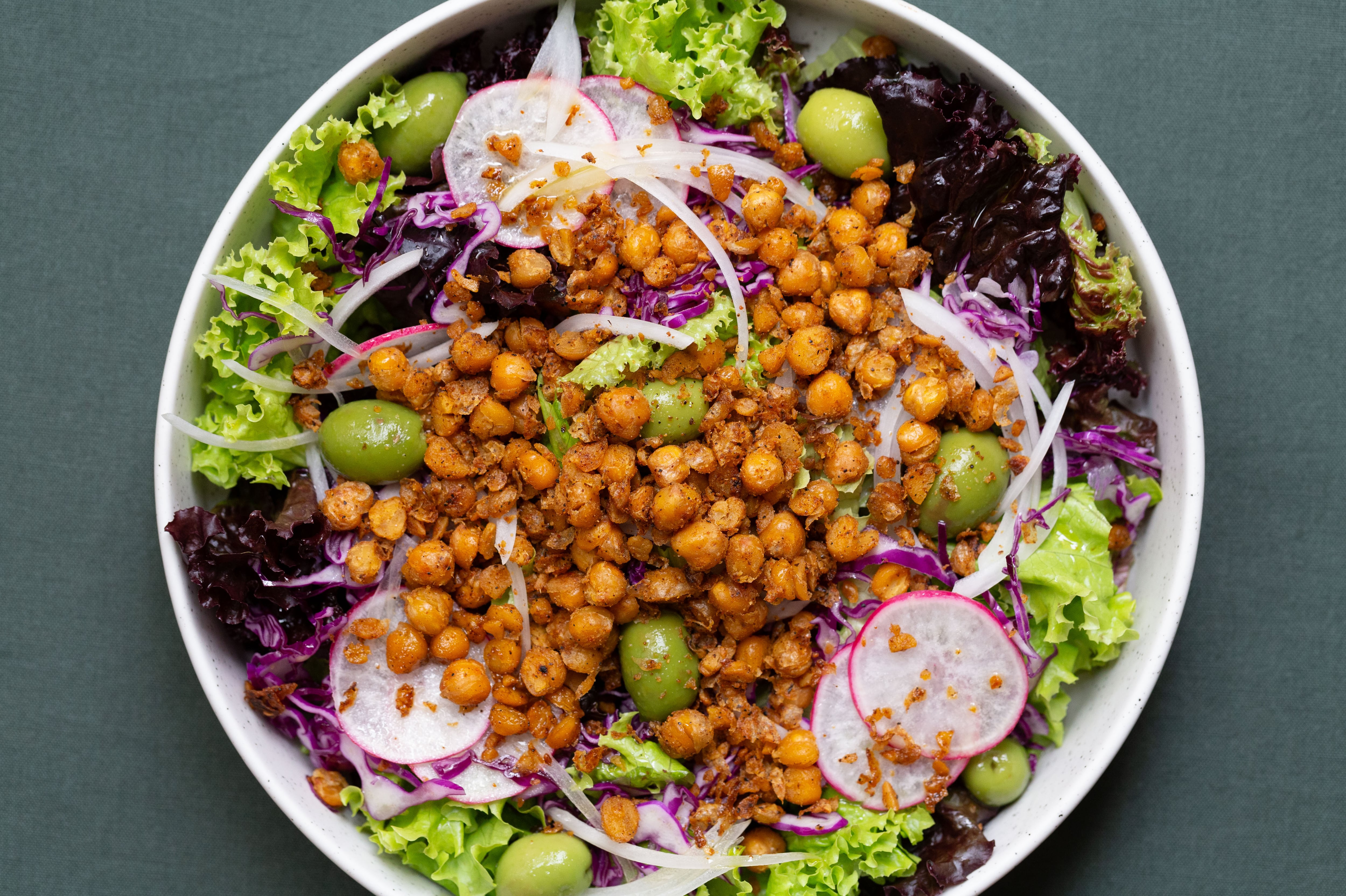 Si tienes una freidora de aire, no dudes en utilizarla teniendo en cuenta que se reducirán los tiempos de cocción y que tendrás que estar pendiente de remover los garbanzos más seguido para que no se quemen. En cuanto al resto de ingredientes de la ensalada, haz y deshaz como quieras, tanto que incluso puedes utilizar los garbanzos crujientes para poner encima de cualquier otro plato.