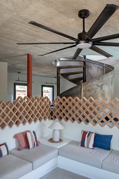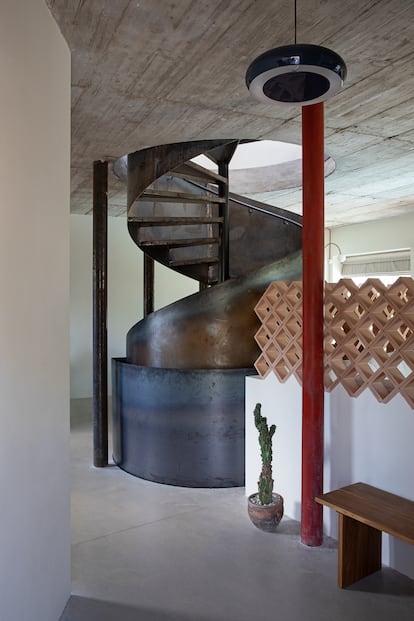“Es un refugio climático contemporáneo, pero como el clima es ahora más agresivo, sí que tiene máquinas de aire acondicionado de apoyo por si hacen falta en verano”, destaca el especialista. El sótano, en contacto con la tierra, añade también aire caliente a la casa. Y las ventanas permiten ventilación cruzada cuando hay que refrescar con el apoyo de una gran claraboya en la cubierta, construida con hormigón al que se añadió la textura de las viejas maderas con las que se hizo el encofrado. Tiene pequeñas pendientes y una canaleta perimetral que recoge el agua de lluvia y la dirige hacia un aljibe para su reutilización en el riego del jardín. “Podría haber sido plana, pero así tiene algo más de gracia”, apunta Carrillo. El tragaluz que hay en su centro es justo el lugar por el que entró otro de los elementos más singulares de la vivienda: una escalera fabricada a medida en Metálicas Serrafor —en Archidona— que se instaló con una grúa ya al final de la obra. Une las tres plantas y ejerce también como el tiro de una chimenea para expulsar el calor.