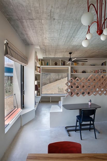 Desde el exterior la casa es, efectivamente, como un OVNI cuadrado recién aterrizado en su barrio, Hacienda Paredes, en la zona alta de Pedregalejo, al este de Málaga. Para llegar a su interior hay que atravesar una pasarela que salta el desnivel. La primera planta es diáfana y de hormigón pulido. Más allá de un pequeño aseo, el espacio se reparte entre la cocina con isla, una mesa comedor y un sofá que ejerce de sala de estar separado por una sencilla celosía. Los muebles son de obra, como los armarios de las habitaciones, ya en la segunda planta y sin jerarquías: son todas del mismo tamaño. Ahí los 81 metros cuadrados se reparten entre la habitación de los padres con el baño en suite —de azulejos de Atlas Concorde— y las dos del hijo y la hija, que comparten un baño con plato de ducha, inodoro y doble lavabo. Las alturas van desde los tres metros en las zonas más altas a los 2,60 en las más bajas, con puertas a medida —de DM hidrófugo y diseñadas por Carrillo— de color verdoso.