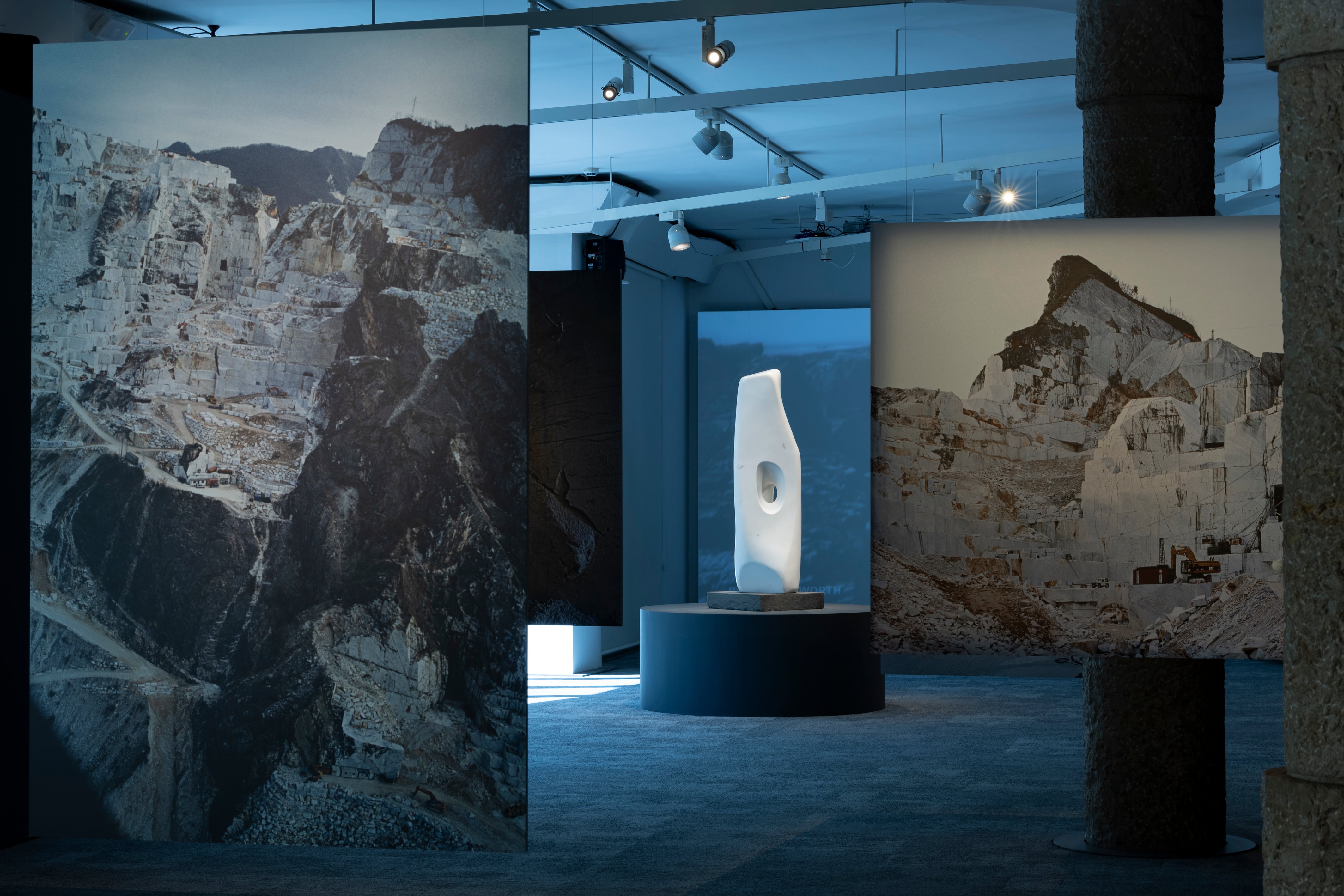 Aquella generación de grandes artistas del segundo tercio del siglo XX se centró mayormente en la escultura abstracta, supo crear formas nuevas y, sobre todo, aprovechó el vacío para moldearlo con luces y sombras. Esta es una de las muy buenas cualidades de la exposición: las esculturas están muy bien iluminadas, los visitantes podemos dar la vuelta en torno a muchas de ellas, enmarcarlas en las tres dimensiones de las salas del edificio de Gaudí y, más allá de él, llevar la vista al cruce de las calles Provença y Passeig de Gràcia. La piedra como continente y contenido hasta en sus vacíos y en sus orígenes: una faceta más de esta exposición inagotable está en las fotografías de las canteras de Carrara, de Aglaia Conrad. El mármol alpino de Carrara -el de la Columna de Trajano y del David de Miguel Ángel- apreciado desde hace más de dos mil años por su blancura y sus tonalidades entre azul y gris, casi sin vetas, arrancado de la montaña hasta llegar a las mejores de nuestras calles, plazas y museos. Hay mucho talento reunido en La Pedrera. Anna Molins, por recordar a una más, es la directora de fotografía de esta exposición inacabable. Todos ellos han sabido recordarnos que las esculturas cambian a cada rato con la luz y las sombras que las envuelven. Miguel Ángel, arquitecto, pintor y poeta, escogía decir de sí mismo que era escultor.