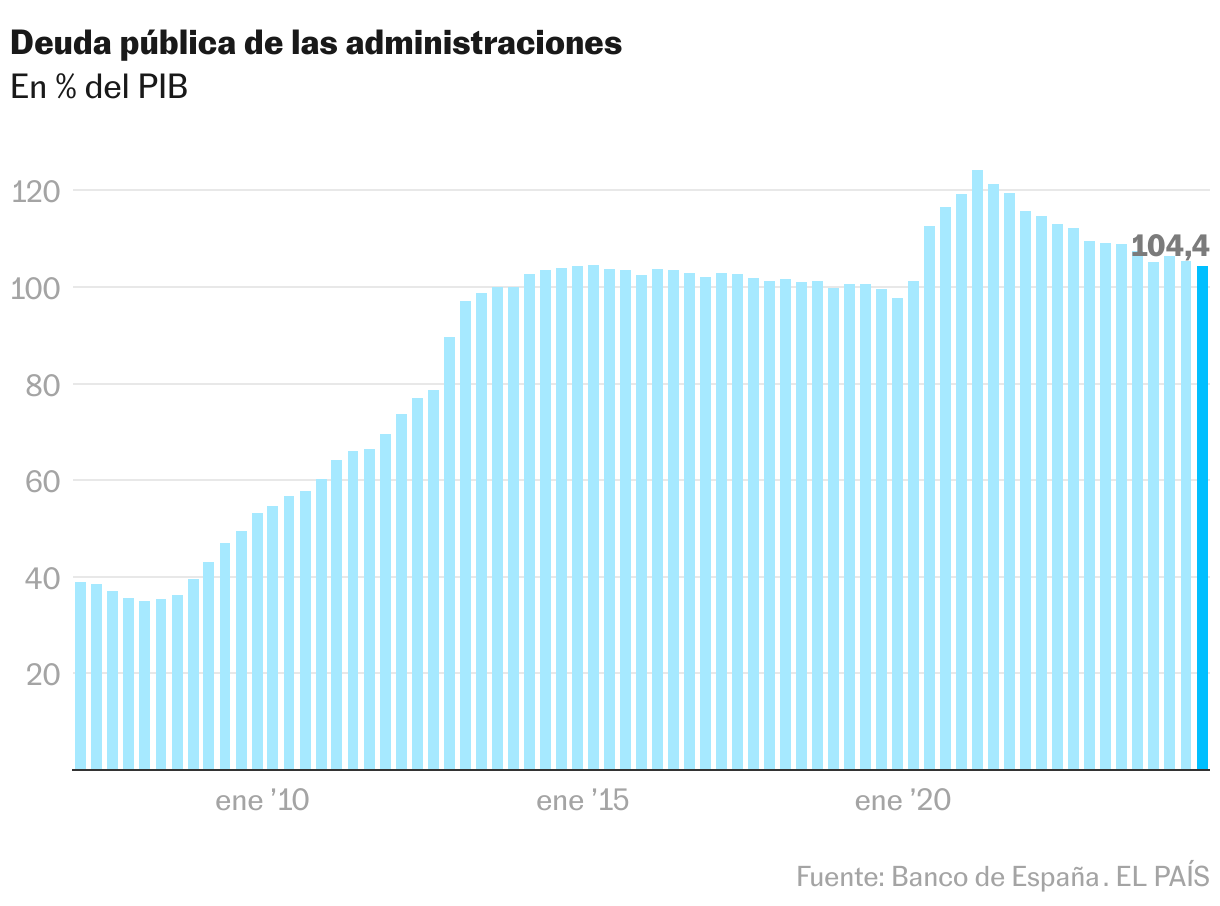 El otro elemento de riesgo está ligado a los compromisos de consolidación fiscal adquiridos con Bruselas. La AIRef ya advertía en noviembre del año pasado de que el plan fiscal que el Gobierno ha presentado en Bruselas no garantiza el cumplimiento de los objetivos de déficit y deuda previstos. Abordar el ajuste quizá no golpee de lleno en 2025 porque el Gobierno se ha concedido más margen para este ejercicio con la retirada de las ayudas por la inflación y logrando que Bruselas acepte que los objetivos sean más relajados para este año. La Comisión Europea exigía a España que el gasto solo aumentara un 2,8% anual en promedio durante los próximos siete años y un 3,2% en 2025. Sin embargo, en el último momento ha permitido que el gasto pueda elevarse el año que viene hasta el entorno del 5%. Sin embargo, lo que no se haga hoy pasará factura mañana, y a partir de 2026 serán necesarios mayores esfuerzos.