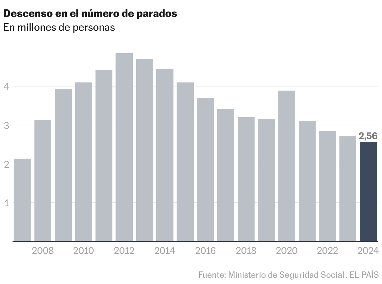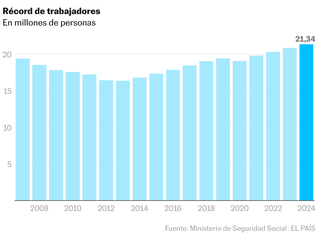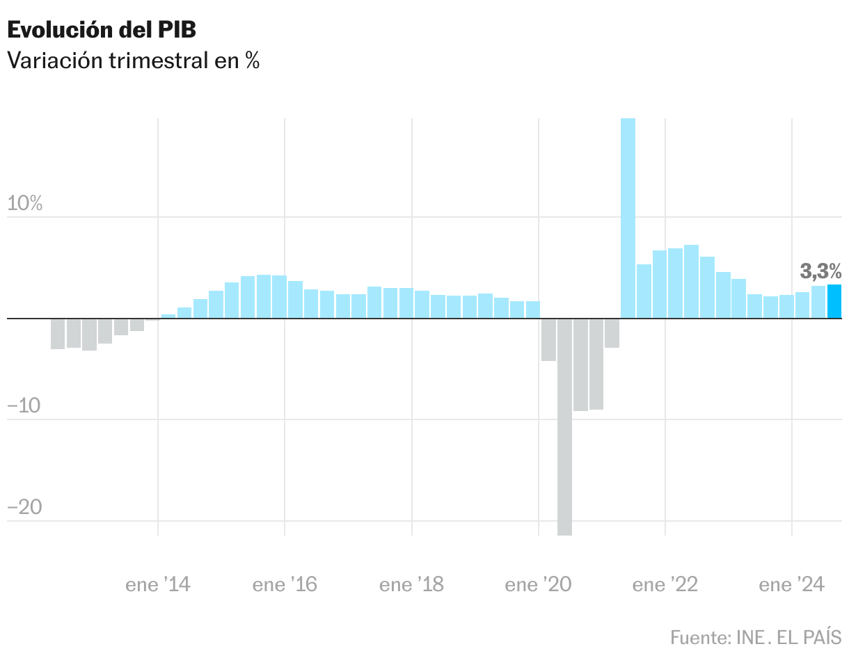 El país tiene de su lado las altas tasas de ahorro acumuladas por las familias y el bajo endeudamiento empresarial, que podrían impulsar un mayor consumo privado. La actividad exhibe una robustez inusitada, sustentada en la buena marcha del mercado laboral y los más de medio millón de puestos de trabajo creados en 2024. Las exportaciones turísticas y de servicios no turísticos han repuntado con fuerza durante el año pasado y se prevé que sigan en la misma línea. Los tipos de interés han caído y con ello la presión sobre la deuda nacional ―gracias a que se reducen los intereses y también la prima de riesgo―. Hay un crecimiento sólido, superando la atonía de países como Alemania y Francia. Según el INE, el Producto Interior Bruto avanzó un 0,8% entre julio y septiembre, encadenando cinco trimestres con alzas del 0,7% o más. A la espera de que se conozca el dato del cuarto trimestre, los analistas prevén un cierre anual del 3,1% para 2024, superando el 2,7% de 2023. “Lo ideal sería aprovechar una coyuntura nacional como esta para resolver cuestiones de fondo, pero la falta de estabilidad interna lo hace imposible”, lamenta Lago.