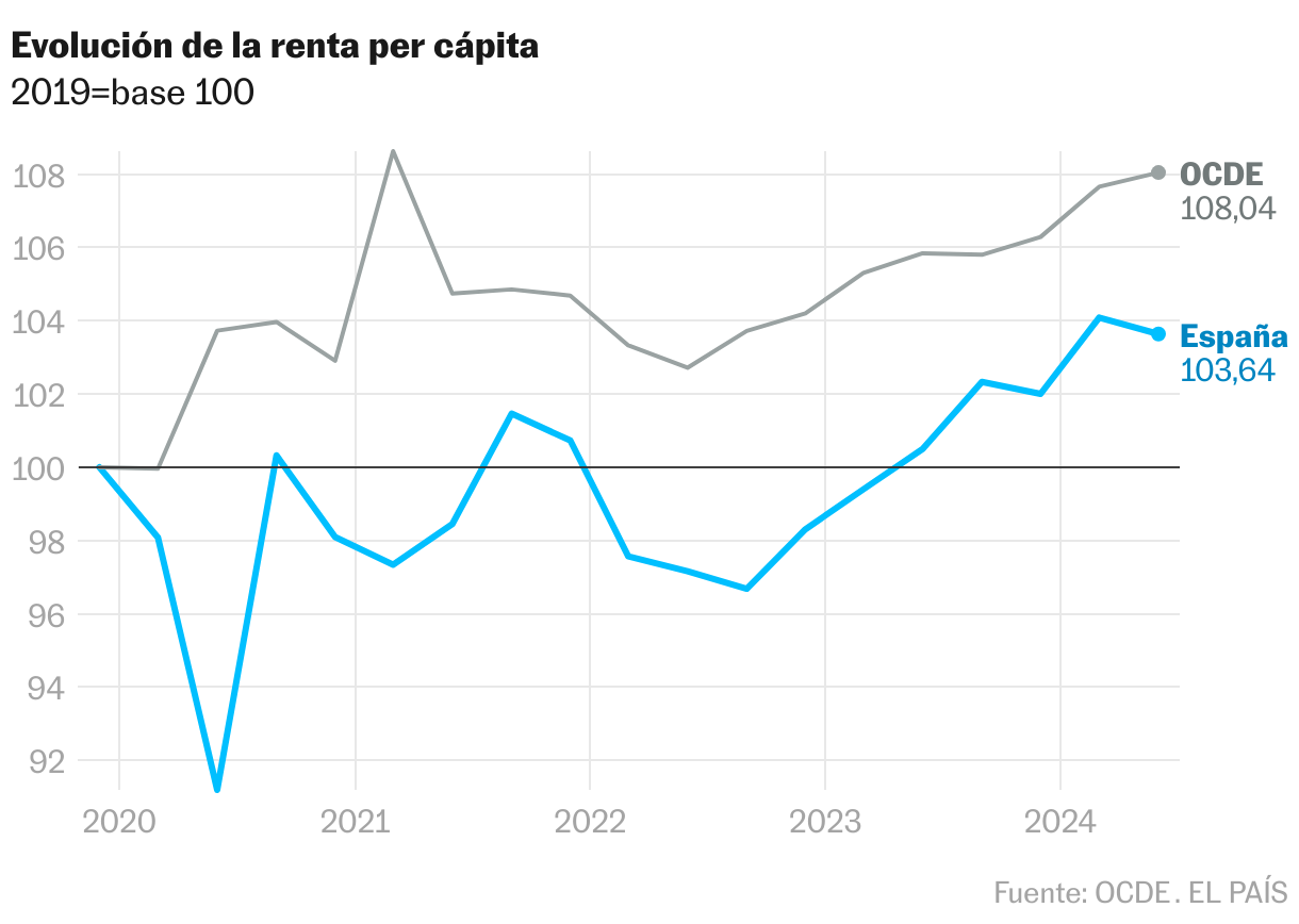 La productividad es otro problema estructural. Junto al elevado desempleo, explica que la economía española no esté logrando converger en renta por habitante con la media europea o de la Organización para la Cooperación y el Desarrollo Económico (OCDE). En lo que va de siglo ha caído más de un 7%, según un informe del Observatorio de la Productividad y la Competitividad en España, creado por la fundación BBVA y el Instituto Valenciano de Investigaciones Económicas (Ivie). La productividad del empleo por hora trabajada ha crecido un 0,7% al año entre 2000 y 2022, pero la del capital —esto es maquinaria, equipamientos tecnológicos, inmuebles e infraestructura— ha retrocedido un 1,2% anual. Así que al final el balance es negativo.